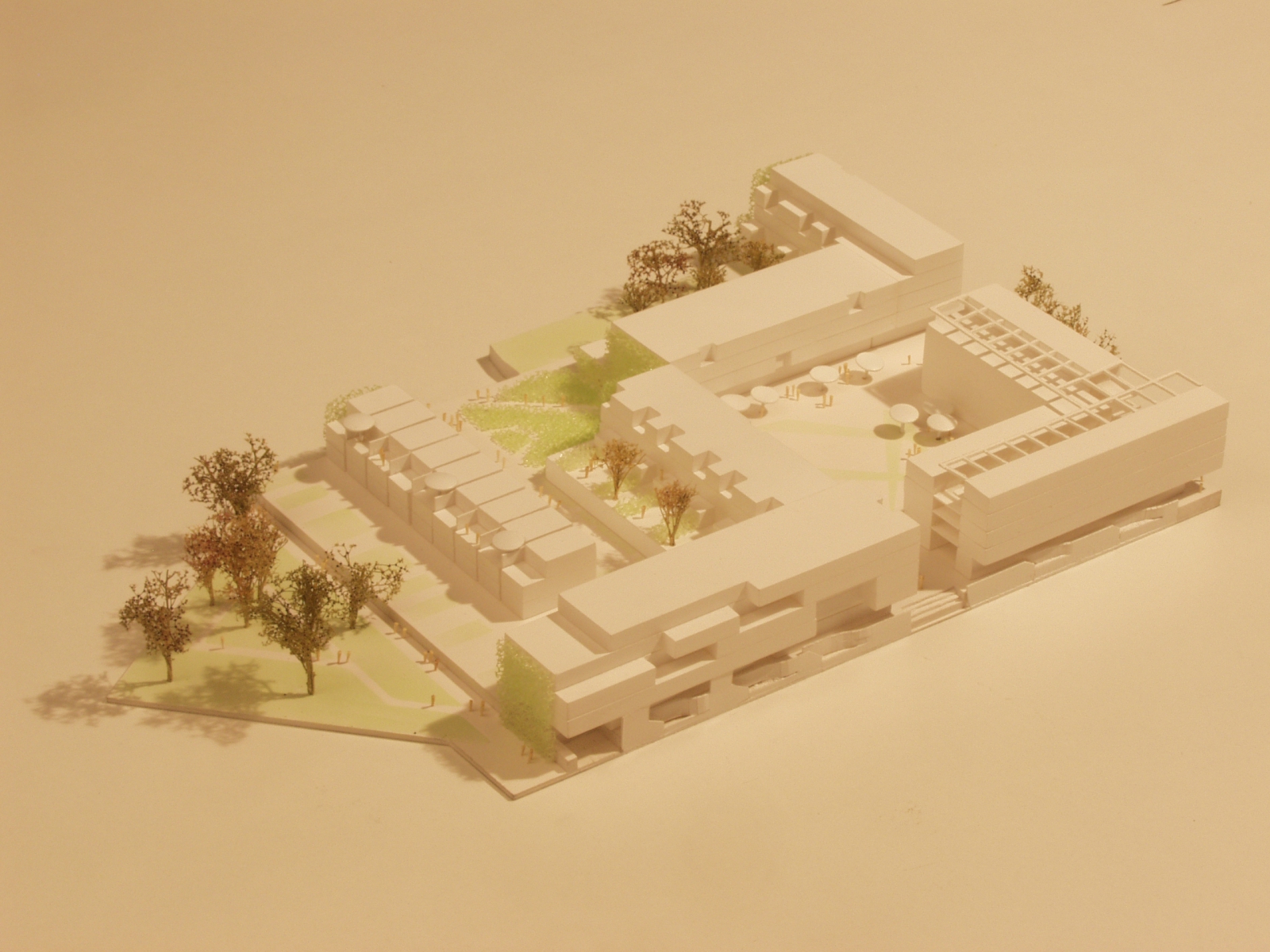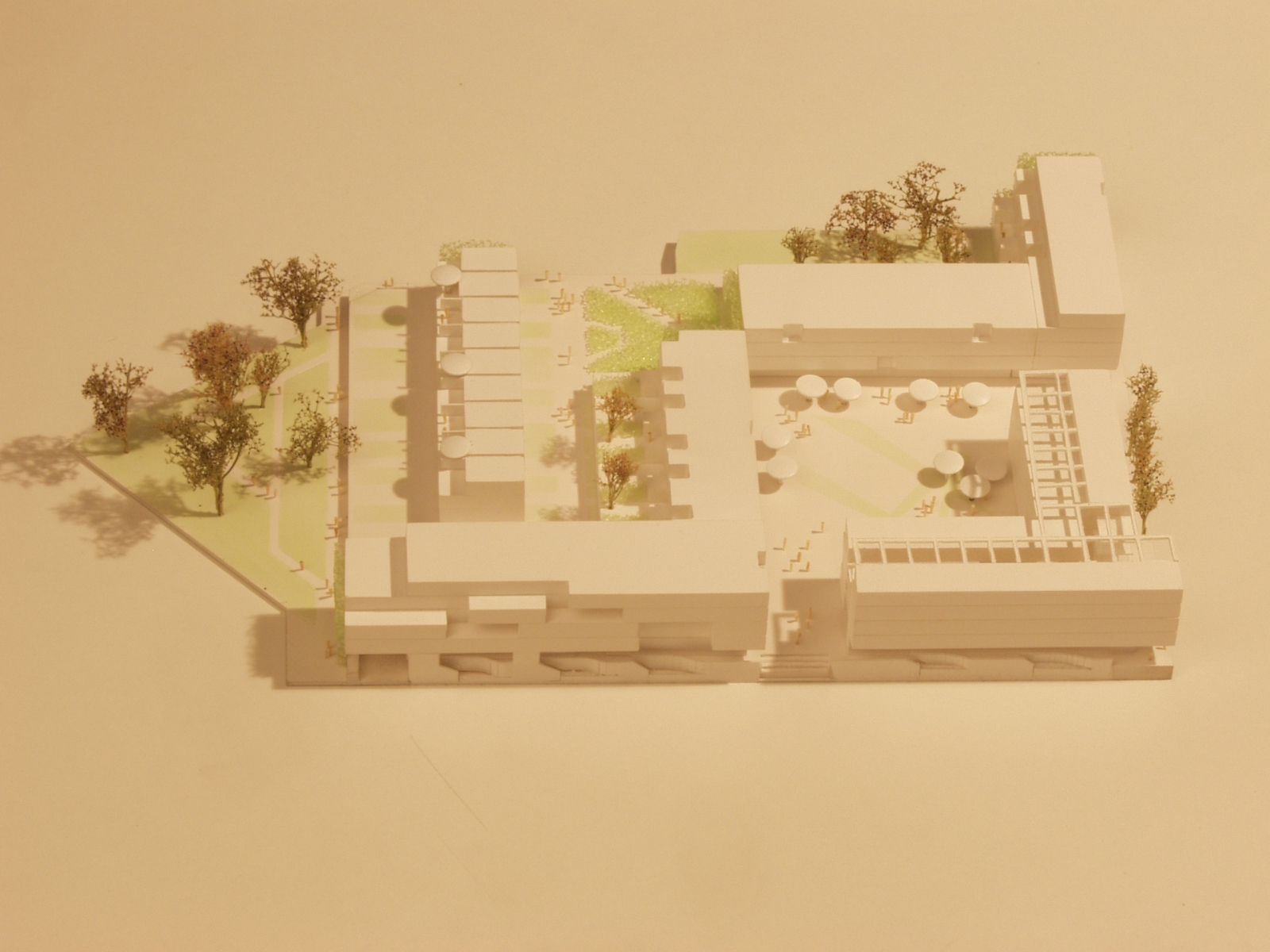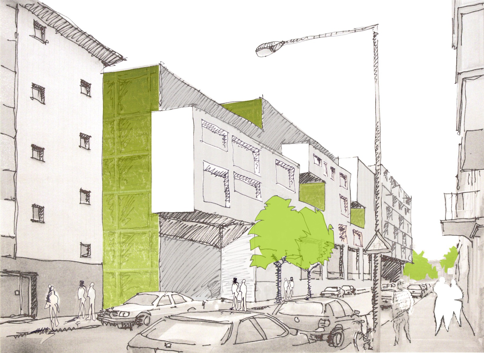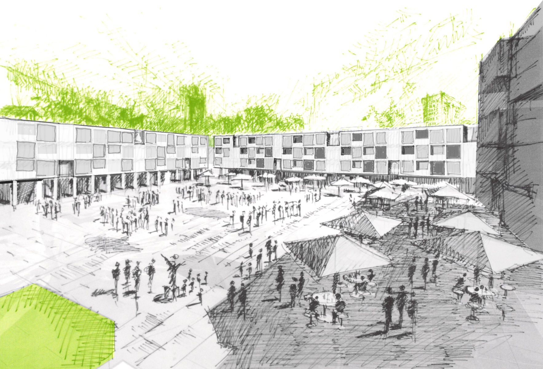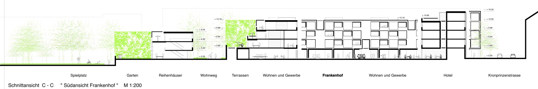 Der Platz zwischen den Gebäuden muss Lasten aus Rettungs- und Lieferfahrzeuge der Klasse SLW 16 ertragen können. Aufgrund der Höhendifferenz zwischen Geländeoberkante und Tiefgaragendecke ist eine Ortbetonergänzung als Verstärkungsmaßnahme möglich. Die bisherige Geschosshöhe der Tiefgarage bleibt im Deckenbereich uneingeschränkt erhalten. Die Tragfähigkeit der Unterzüge kann mit Hilfe von CFK – Lamellen oder Stahllaschen der geänderten Nutzung angepasst werden.