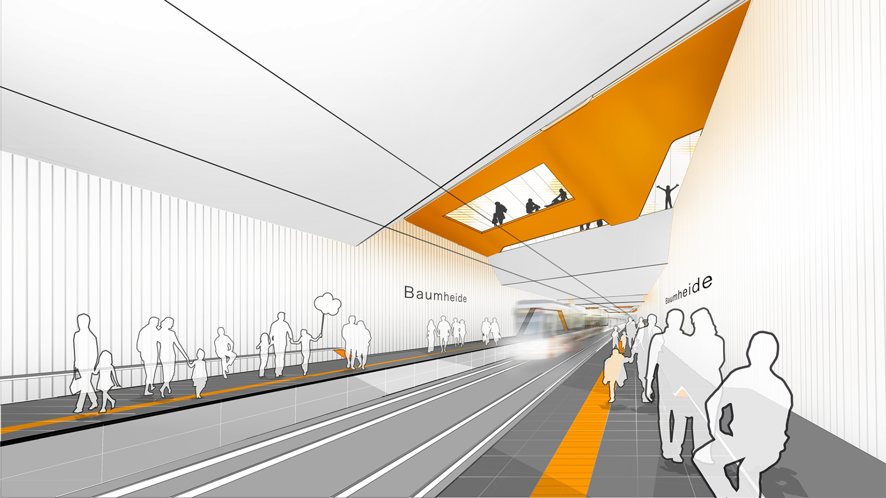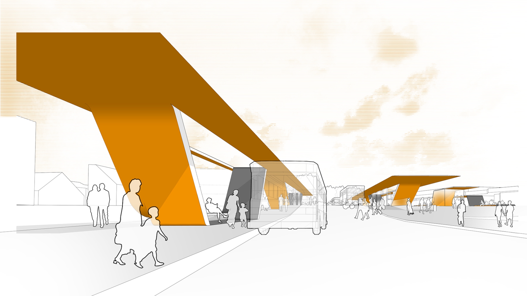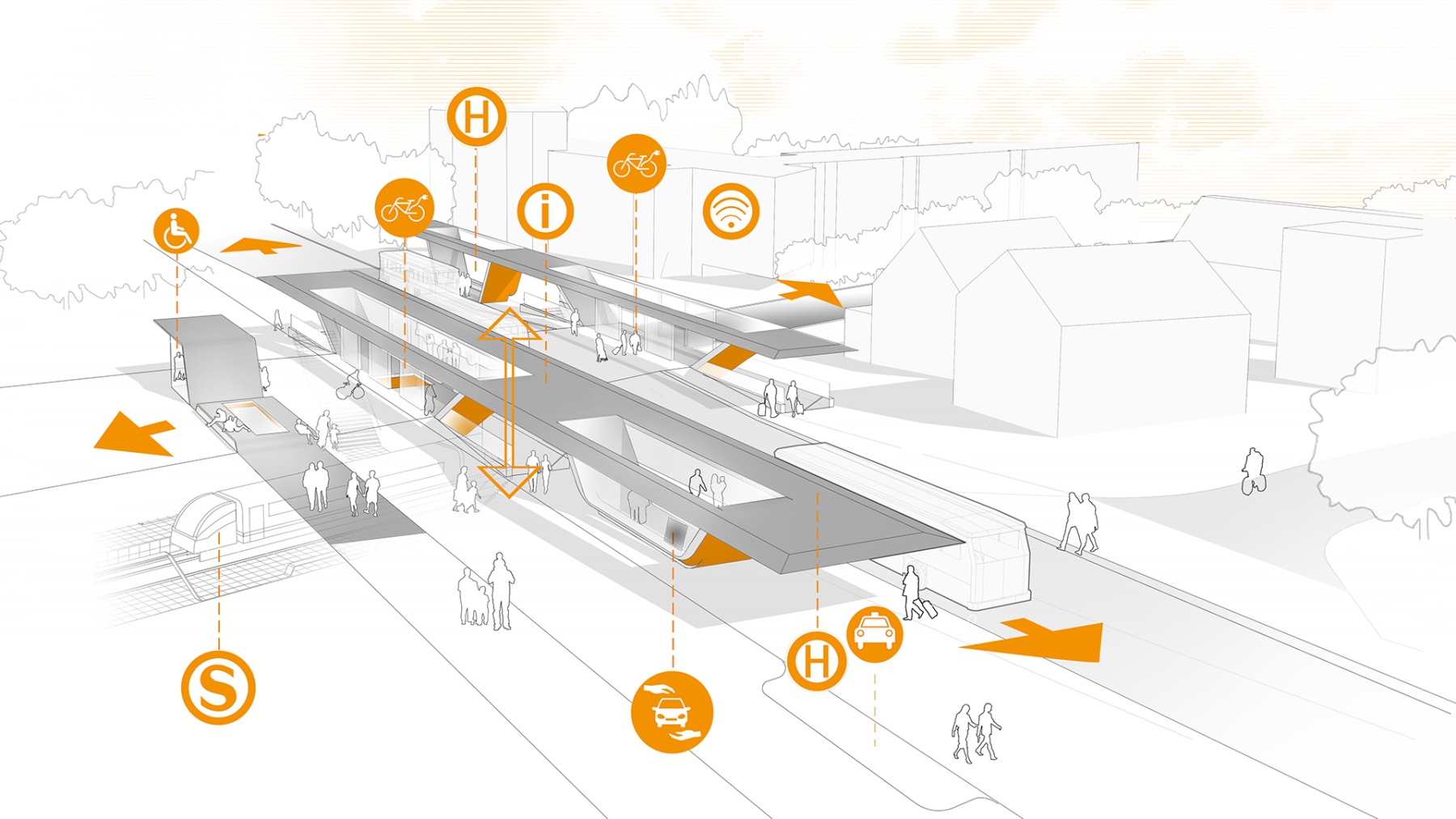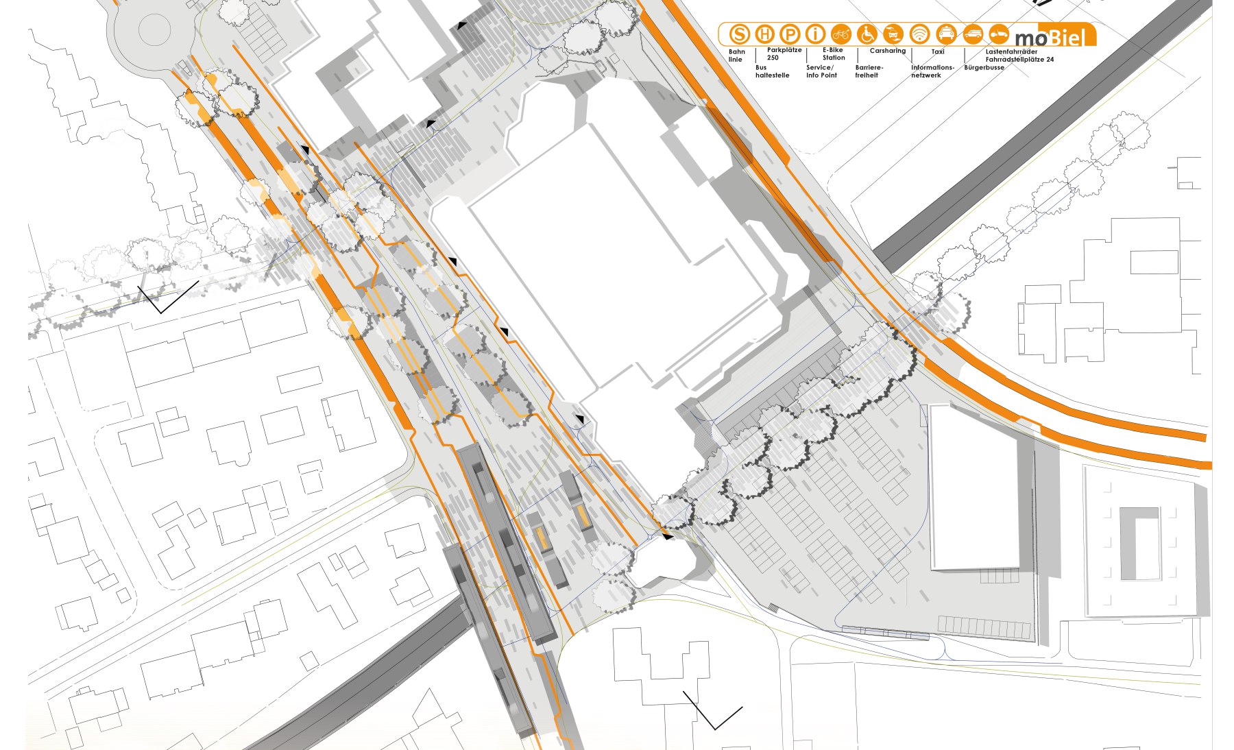 scheinbar dynamisch ausbreitend, die raumprägenden Funktionsträger gesetzt. Die Haltestellen-,