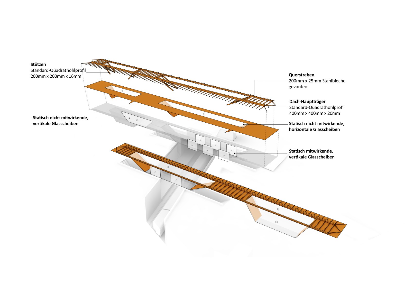 Treppen und Fahrstuhlüberdachungen als markante Anziehungspunkte werden um Sitzelemente