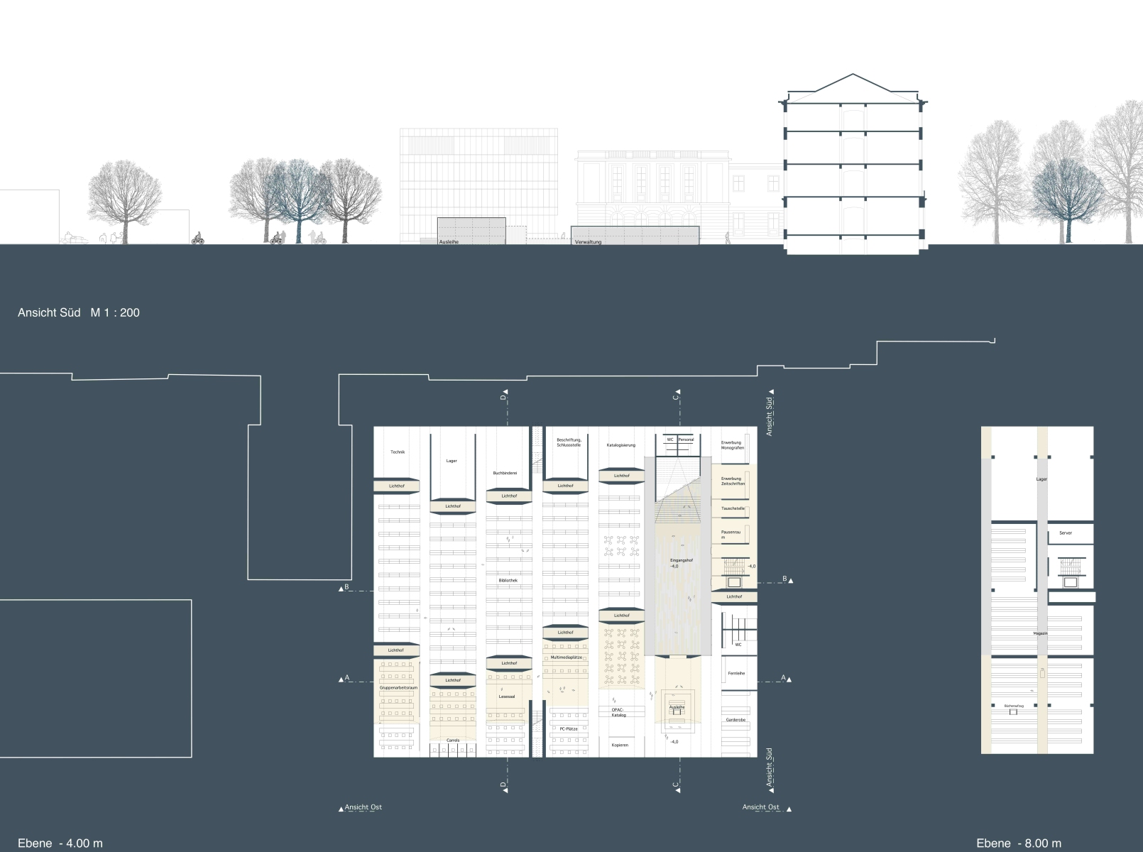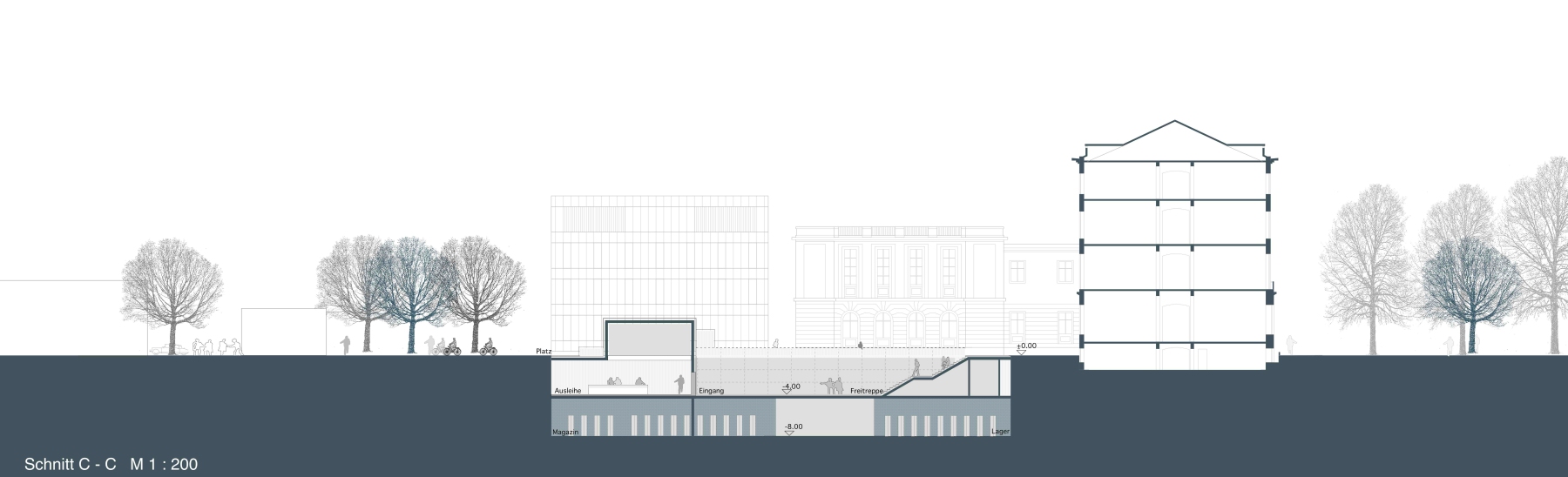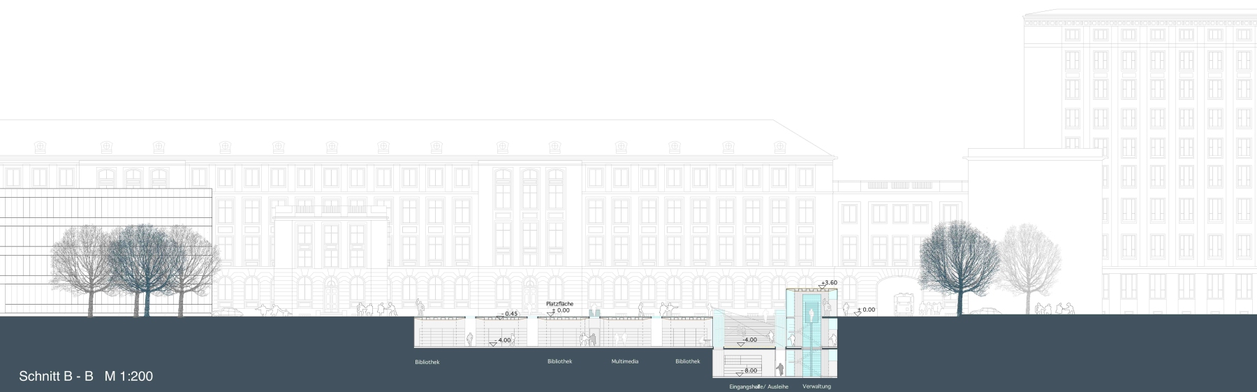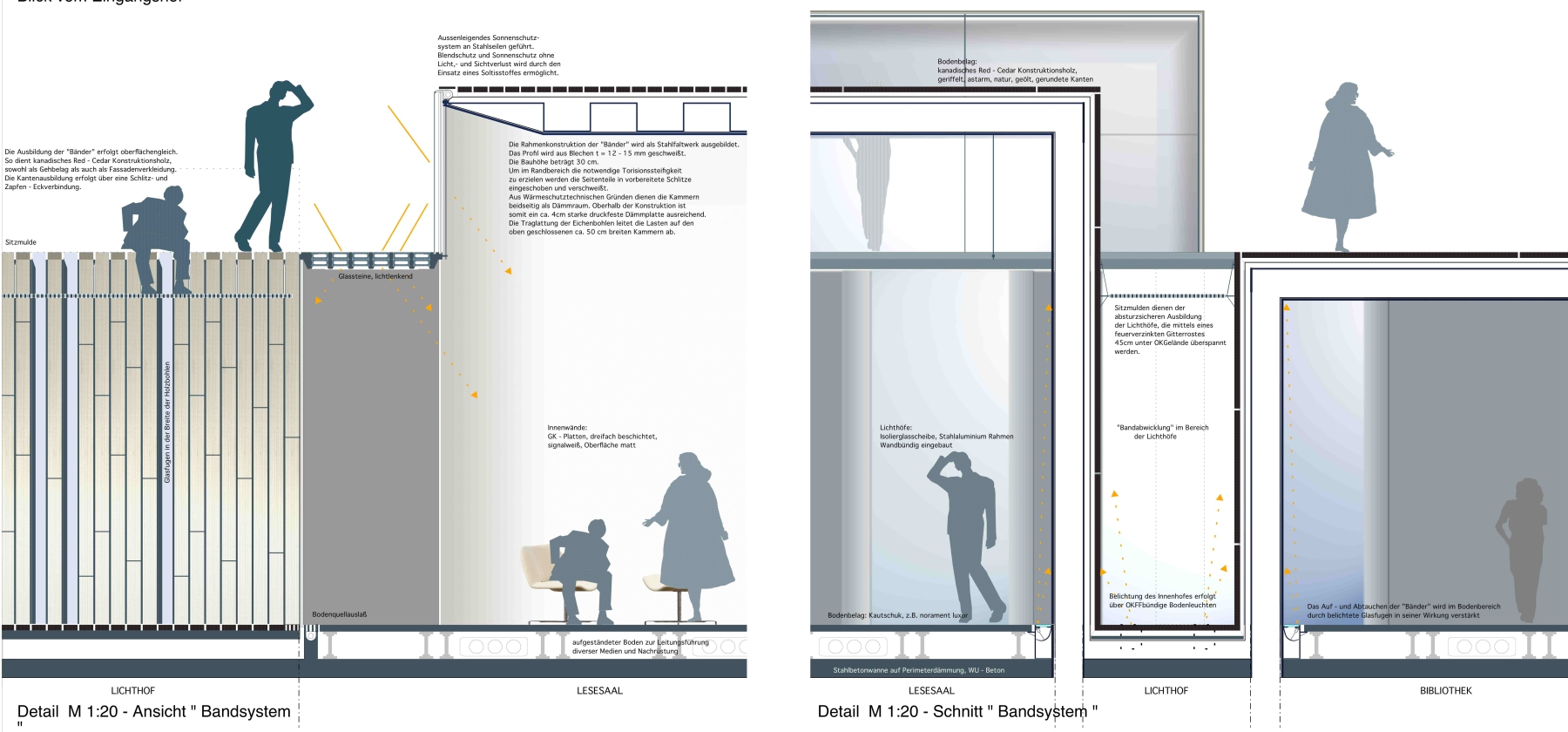 Sinnbild dieses Spannungsfeldes zwischen alltäglicher Betriebsamkeit und dem introvertierten wissenschaftlichen Arbeiten ist die Sequenz von sieben “Bändern”, die in ihrem durch Licht, Fläche und Sicht bestimmten Rhythmus die räumliche Synthese von der Öffentlichkeit eines großzügigen Platzes und der notwendigen Intimität einer Hochschulbibliothek ausbilden.