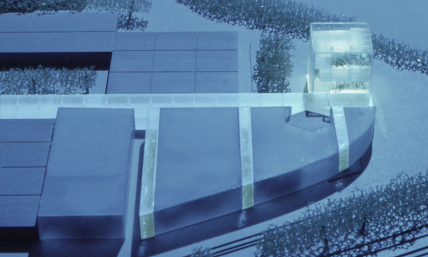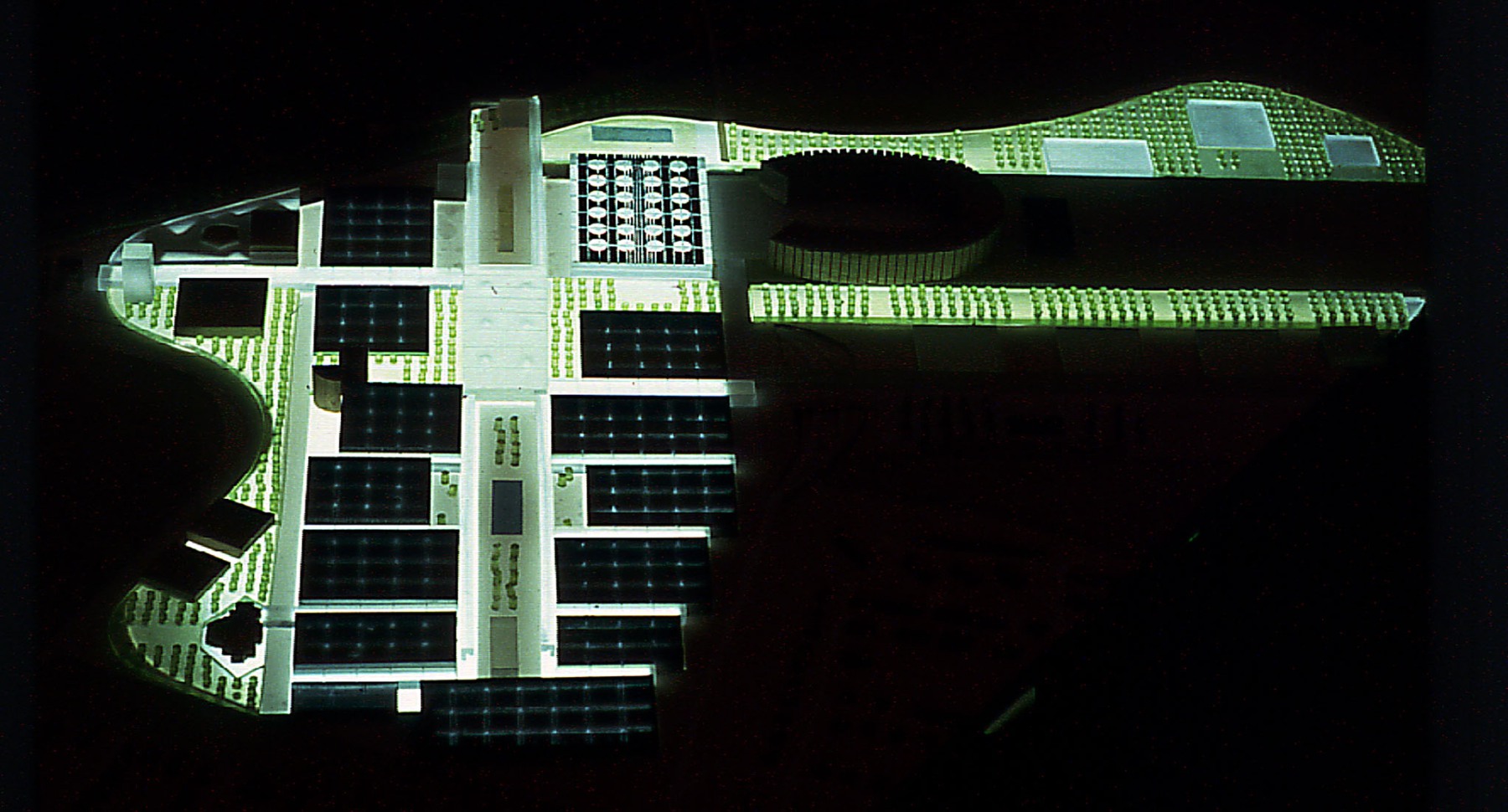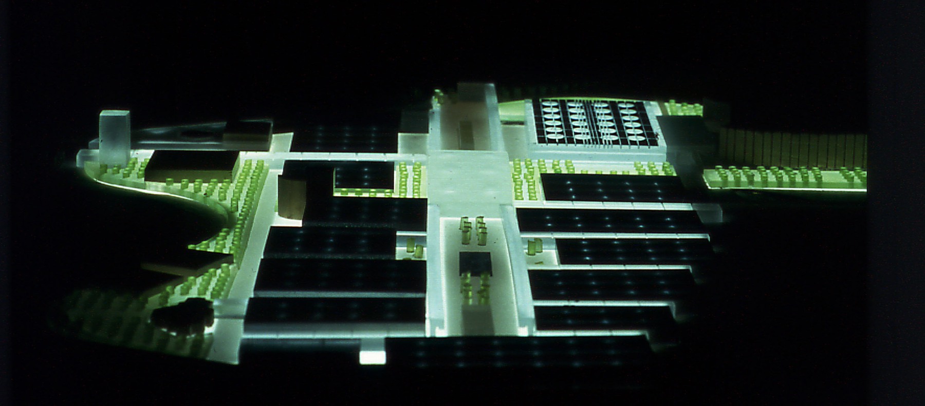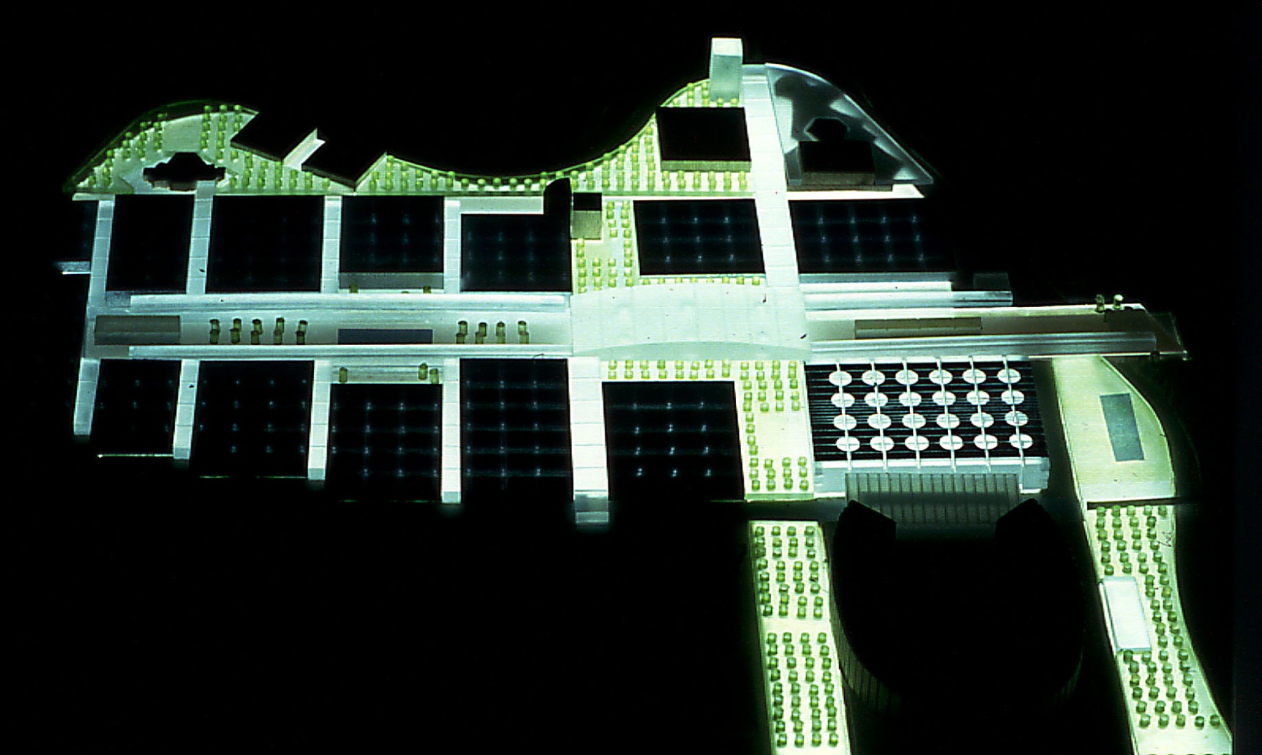 Der Anspruch der Halle, im “Funktionsverbund” zwischen Rheinstadion und Messe zu stehen, begründet ihre städtebaulich im Winkel der beiden Anlagen positionierte Lage und Ausrichtung.