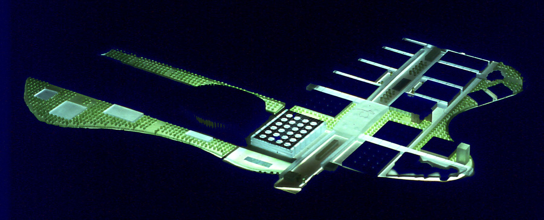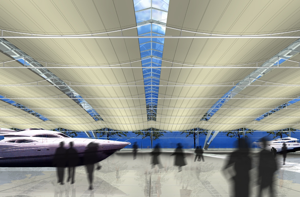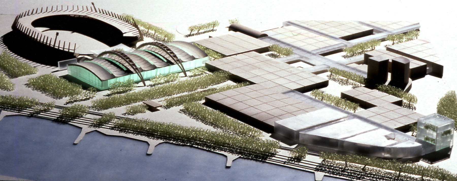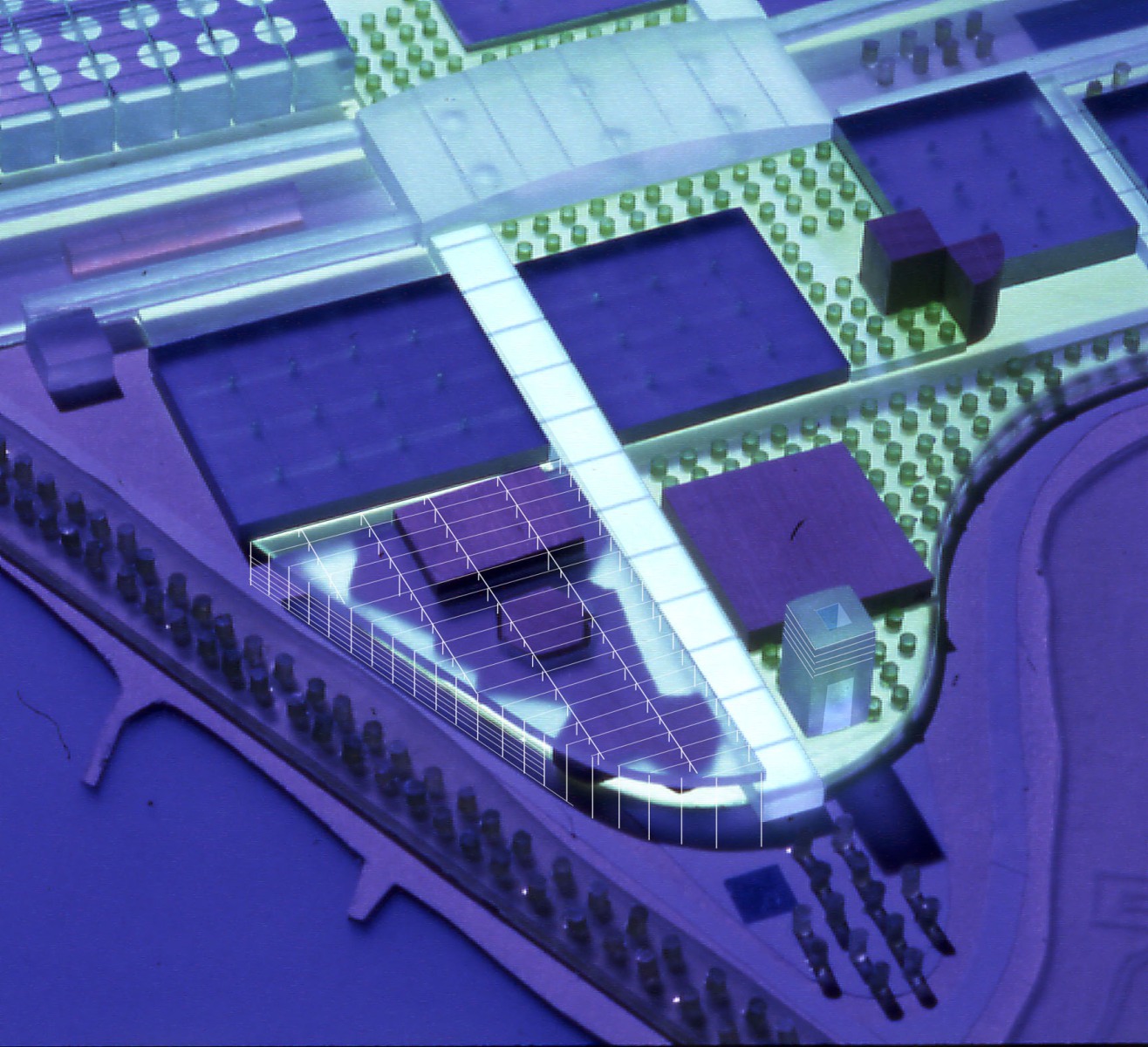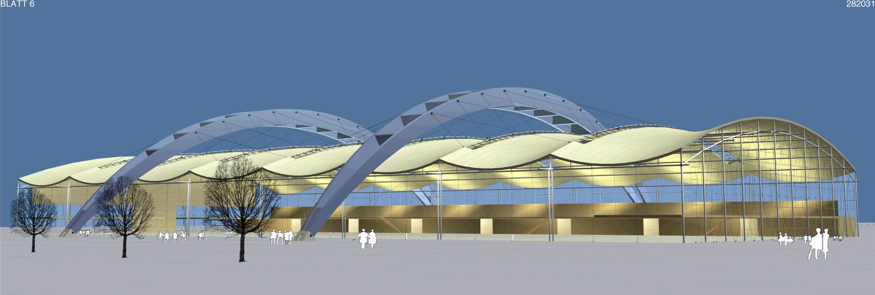 Die Multihalle symbolisiert somit inhaltlich und äußerlich den Bezug einerseits zum Stadion und zur Sportachse, andererseits zur Messe.