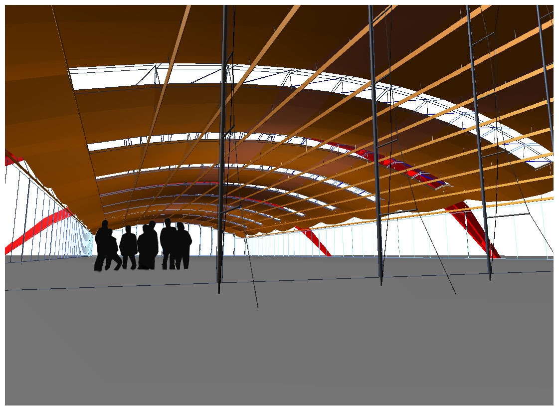 Die als Haupttragwerke ausgebildeten dominanten Brückenträger beziehen die Halle in Maßstab und dynamischer Ausrichtung auf das in Größe und Form prägnante Stadion.