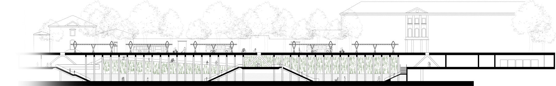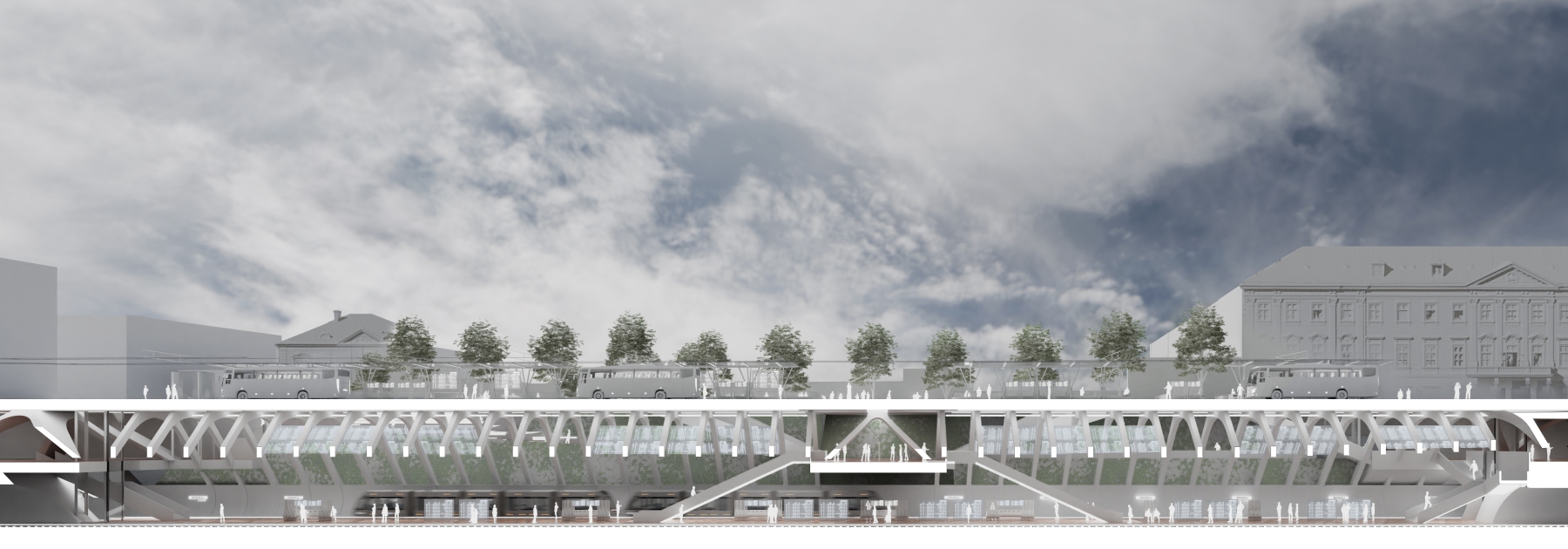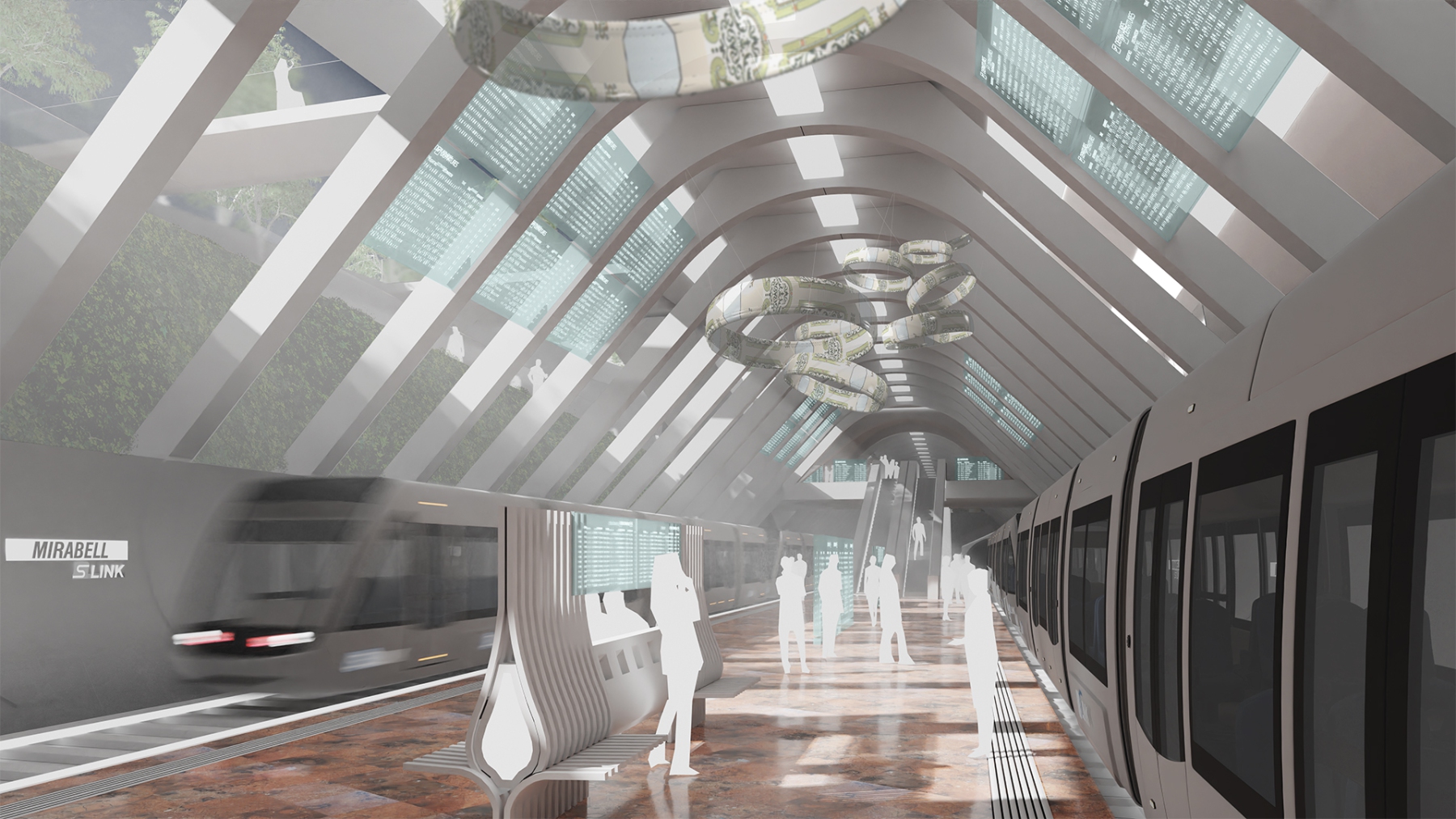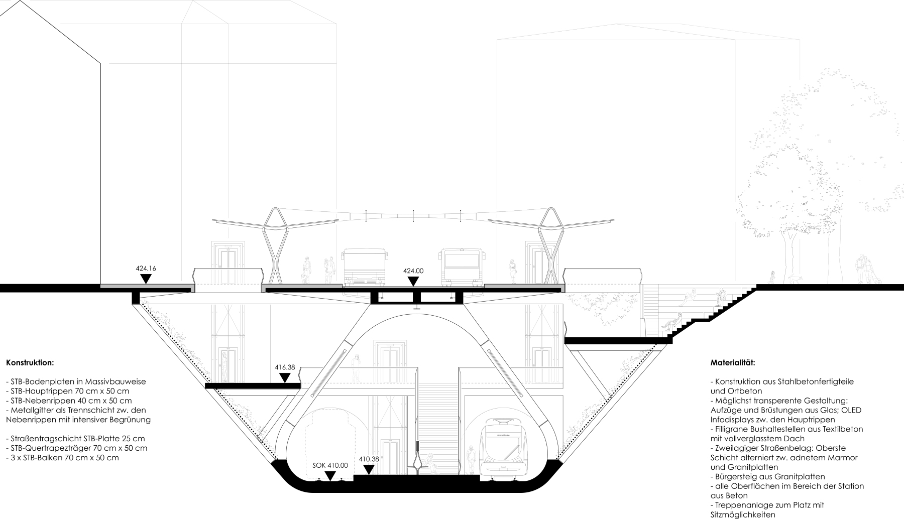 Gleichzeitig „wächst“ mit der Haltestelle der Regionalstadt- bahn der Mirabellplatz in den Boden hinein und erfindet ein unterirdisches Stadtbild – als ikonischen Kunst-, Architektur und Konstruktionsraum durch die Verknüpfung der verschiedenen Raum- und Zeitschichtungen, Aus- und Einblicken, Sichtachsen und Querbezügen.