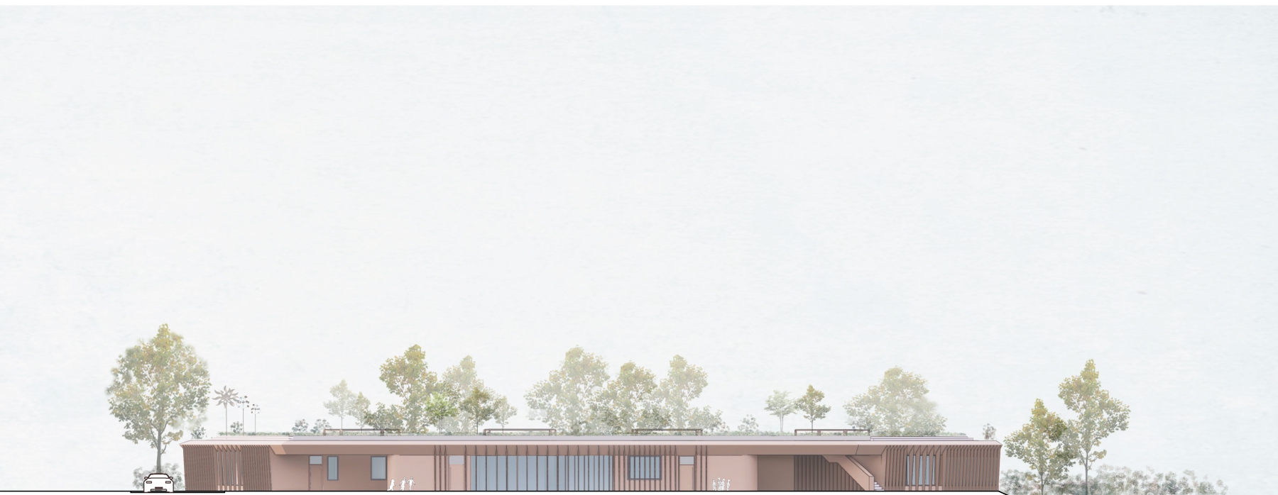 In seiner Höhenentwicklung bleibt das Gebäude unter der Baumkulisse und der benachbarten Bebauung.