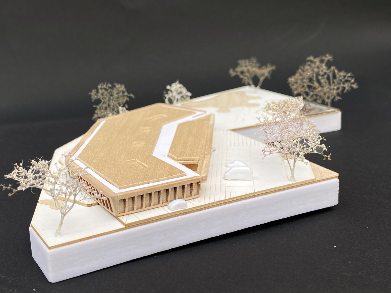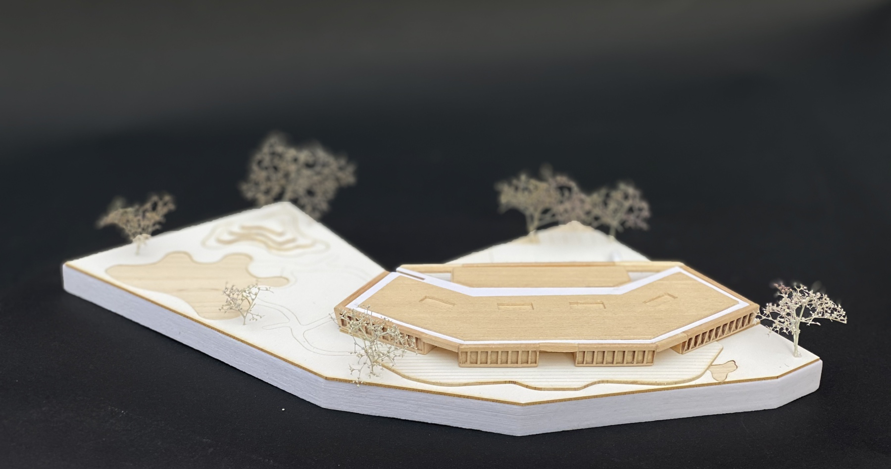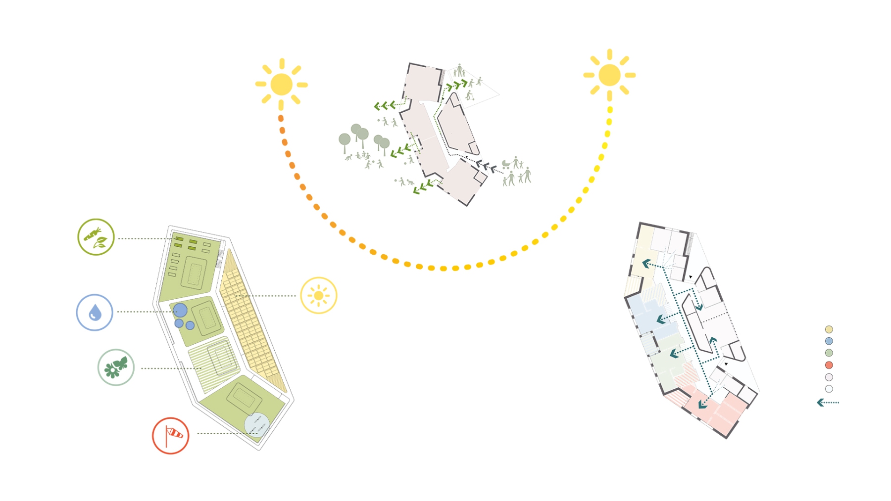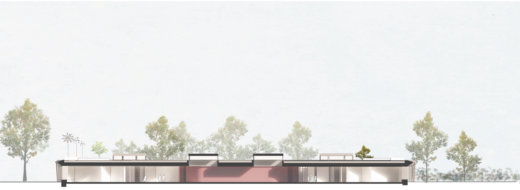 Das Gebäude fügt sich aus den drei Elementen HAND, FLÜGEL und HERZ. Unter dem Schirm umfassen die Flügel das Herz. Die Hand ist das Dach mit dem “Garten der Elemente”, der sanft in die offene Landschaft überleitet. Der Flügel nimmt die vier Gruppen der Kindertagesstätte auf. Der Mehrzweck- und der Speiseraum mit der Küche bilden das Herz. Der Freiraum zwischen Flügel und Herz bietet Platz für Ankunft und Abschied, Versorgung, Austausch und das freie Spiel.