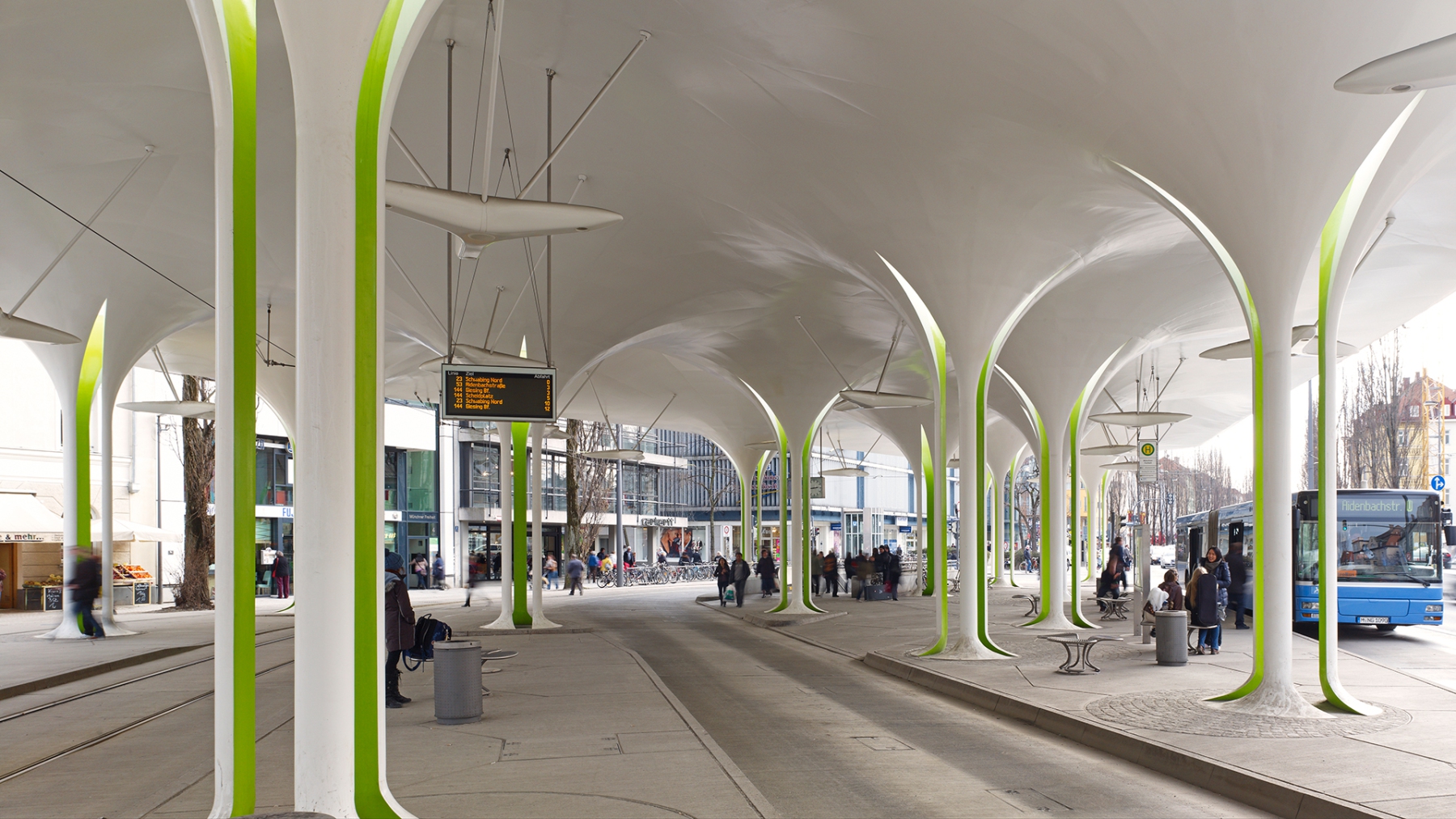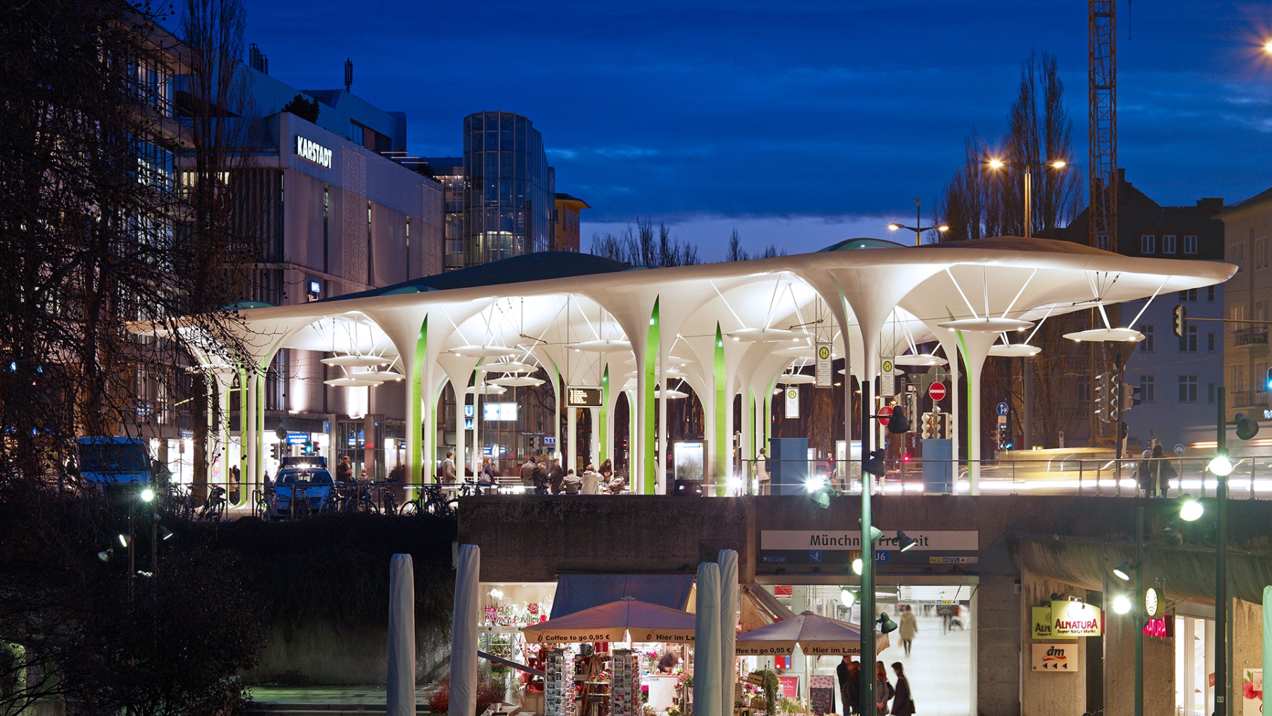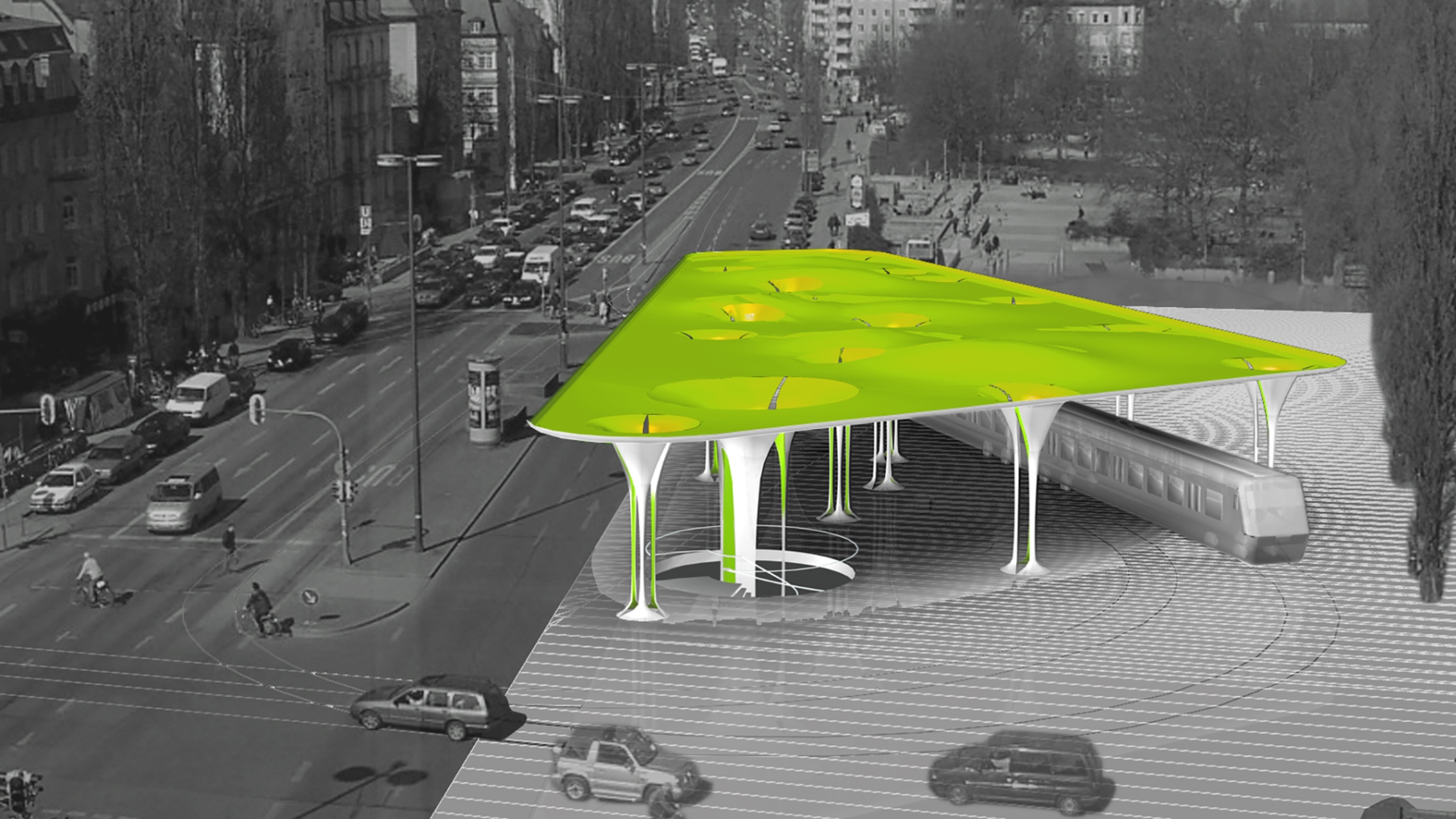 Aus der urbanen Dichte der hoch frequentierten Leopoldstraße erscheint am Ort ihrer Wendung in nördliche Richtung, im schattigen Rhythmus der hochstämmigen Pappeln, eine offene Halle. Die “Allee” aus 18 schlanken Stützen hebt ein sanft geschwungenes Dach wie dichtes Laub, schützend über die Hälfte eines neu entstandenen Platzes. Dach und Stützen vereinigen sich zu einem Gebilde. Dort wo es die Ströme des Bus-, Straßenbahn-, PKW-, Fahrrad- und Fußgängerverkehrs erlauben, wachsen die Stützen wie sich langsam öffnende Kelche aus der Oberfläche des Platzes, in dem sie zu wurzeln scheinen. Regellos und doch begrenzend gliedern die Stützen die Vorgänge auf dem Platz, bieten Schutz und einen durch Sichtbezüge inszenierten nachhaltigen und einzigartigen Eindruck von der Münchener Freiheit.