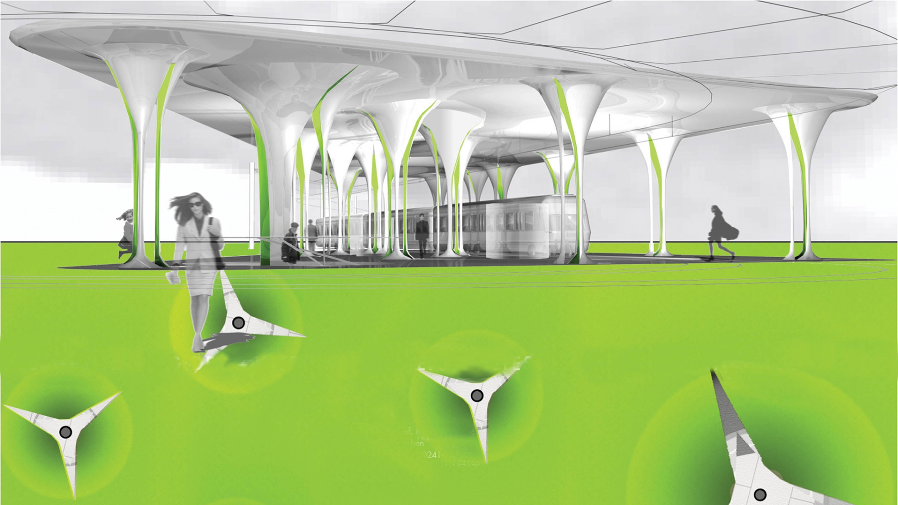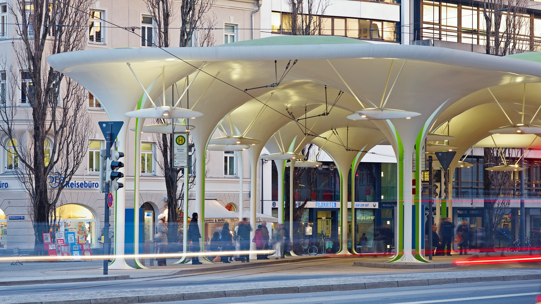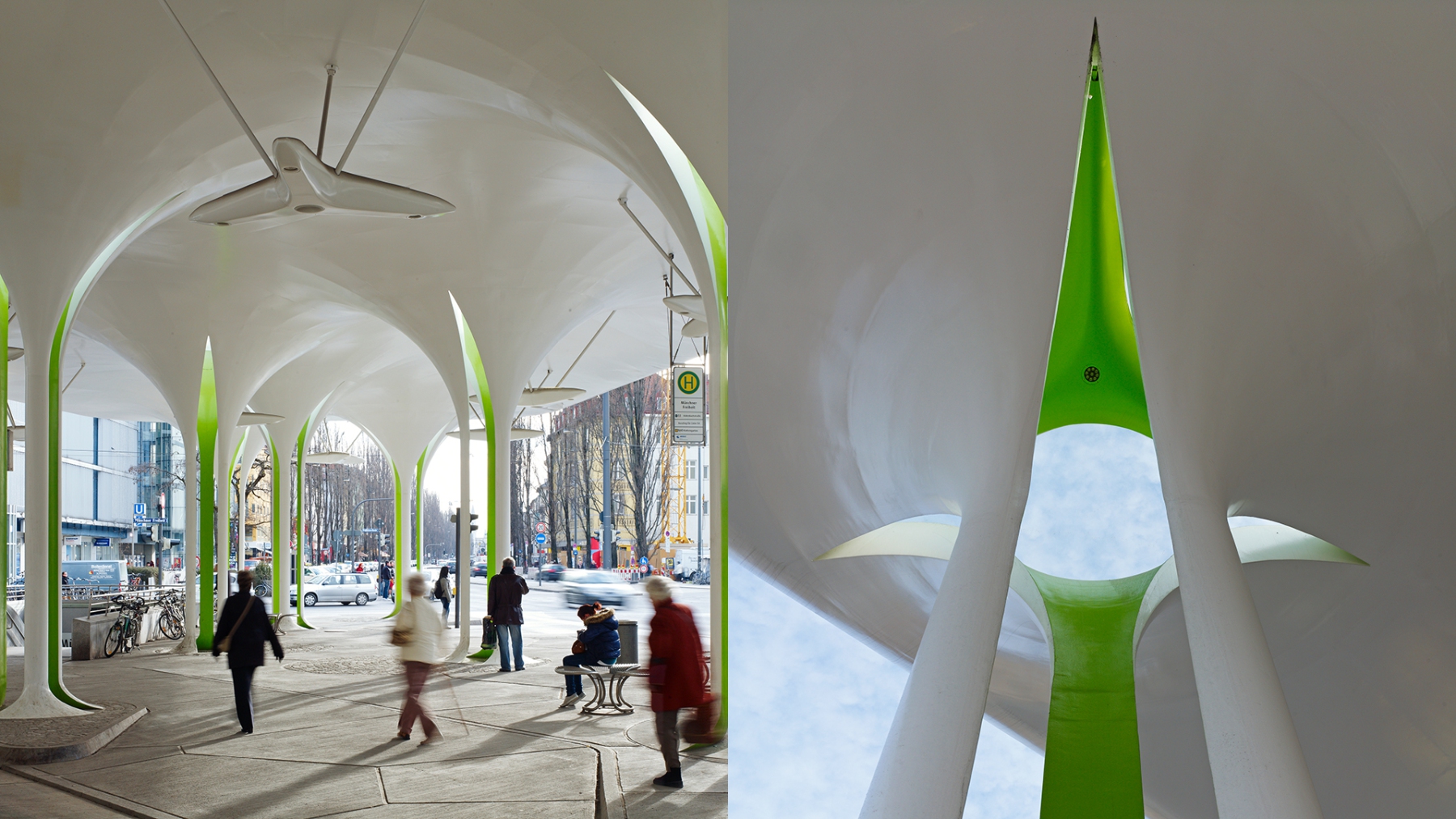 Aus der urbanen Dichte der hoch frequentierten Leopoldstraße erscheint am Ort ihrer Wendung in nördliche Richtung, im schattigen Rhythmus der hochstämmigen Pappeln, eine offene Halle. Die “Allee” aus 18 schlanken Stützen hebt ein sanft geschwungenes Dach wie dichtes Laub, schützend über die Hälfte eines neu entstandenen Platzes. Dach und Stützen vereinigen sich zu einem Gebilde. Dort wo es die Ströme des Bus-, Straßenbahn-, PKW-, Fahrrad- und Fußgängerverkehrs erlauben, wachsen die Stützen wie sich langsam öffnende Kelche aus der Oberfläche des Platzes, in dem sie zu wurzeln scheinen. Regellos und doch begrenzend gliedern die Stützen die Vorgänge auf dem Platz, bieten Schutz und einen durch Sichtbezüge inszenierten nachhaltigen und einzigartigen Eindruck von der Münchener Freiheit.