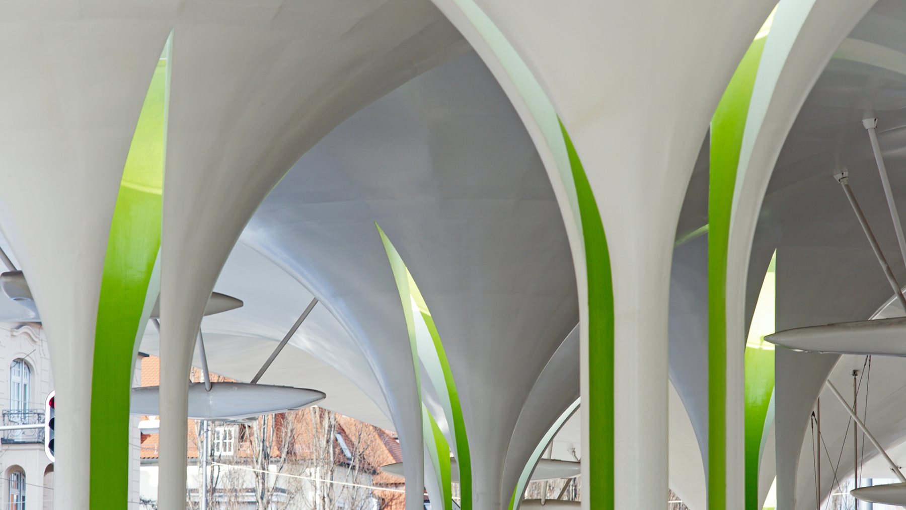 Die Besonderheit dieser Konstruktion besteht in den sternförmigen Öffnungen des Daches im Bereich der Stützen. Diese Öffnungen ermöglichen es, dass Tageslicht unter die Dachkonstruktion fallen kann. Der Dachrand verläuft horizontal. Das gewölbeförmige Dach weist je nach Spannweite bzw. Kraglänge unterschiedliche Stichhöhen zwischen ca. 5,50 und 8,50m auf. An der Dachkonstruktion selbst werden neben den notwendigen Fahrleitungsdrähten auch Ausstattungselemente und Beleuchtungskörper abgehängt.