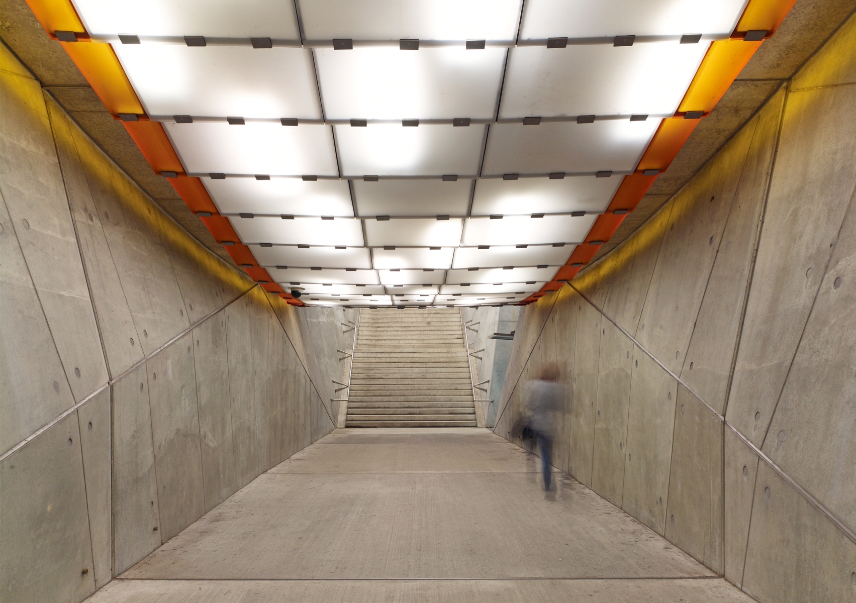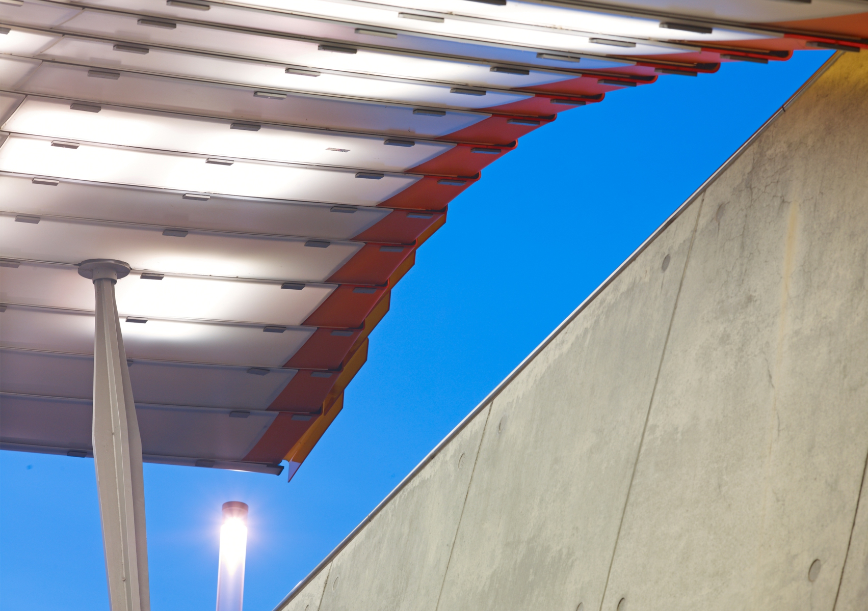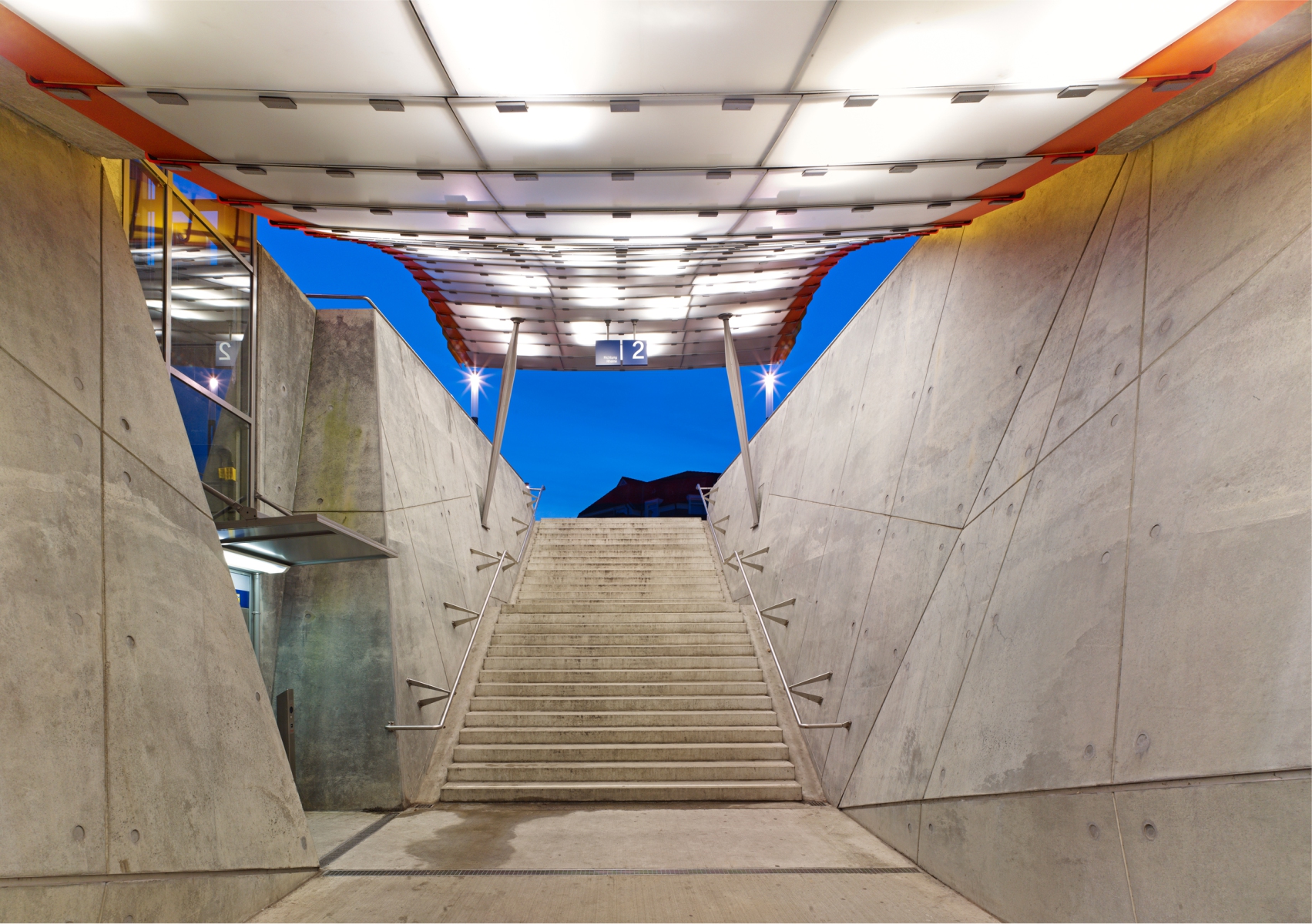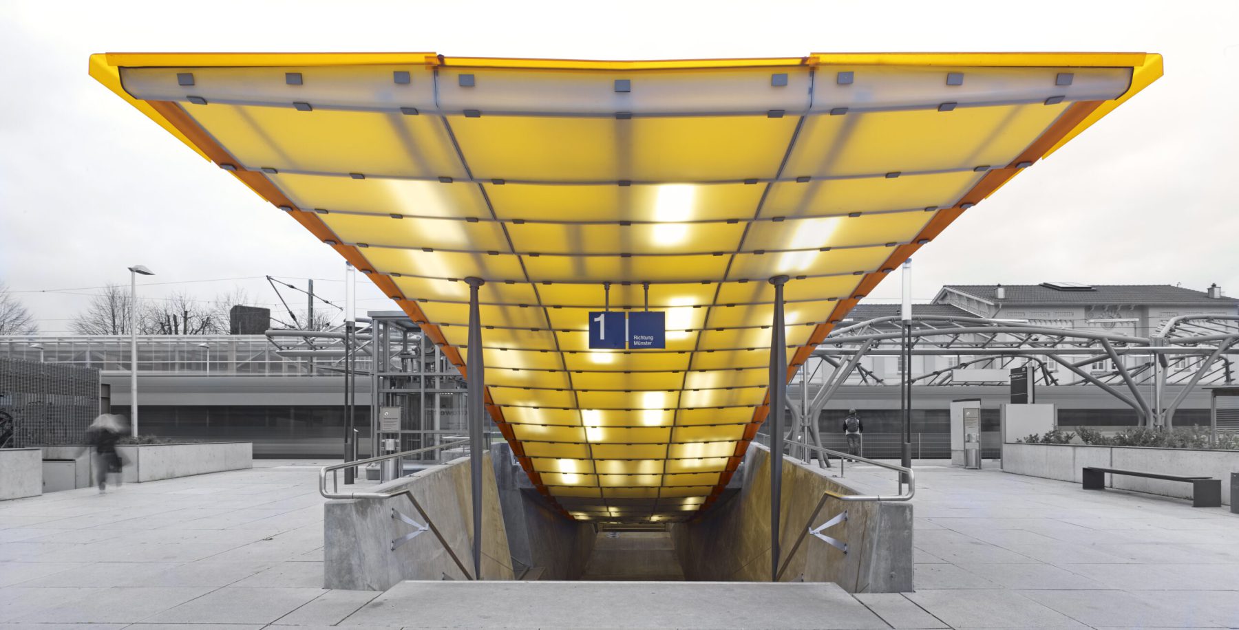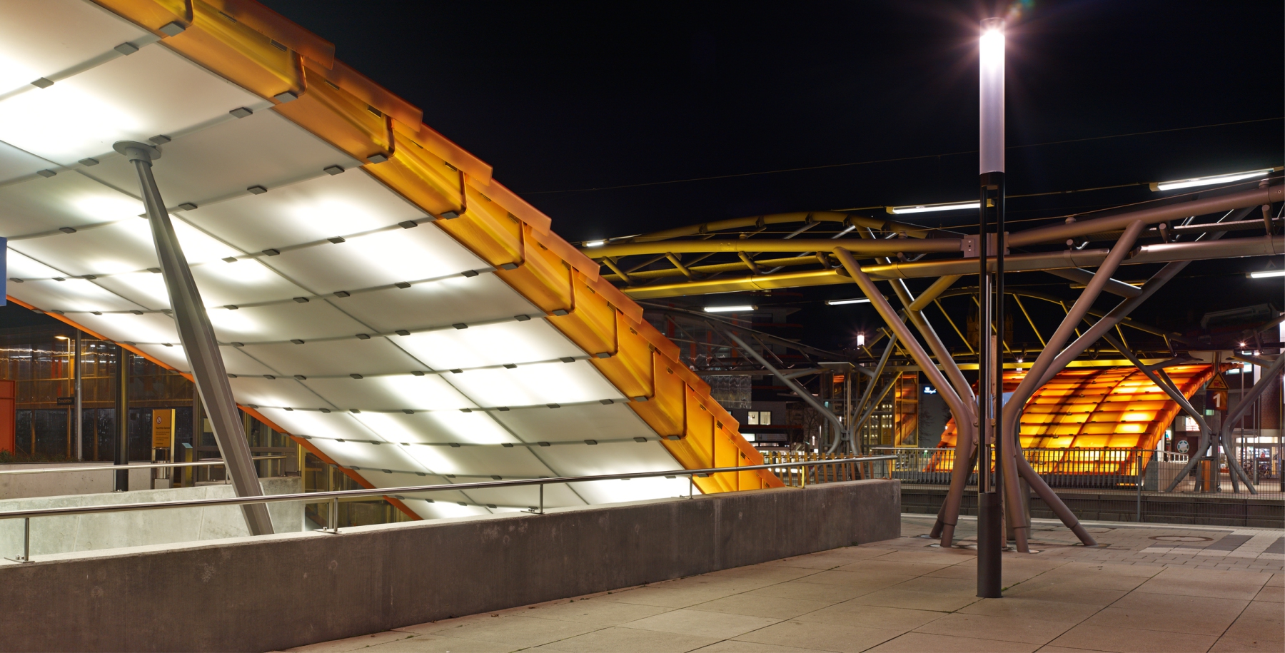 Wartezonen dient. Die auf die leichte Stahlrohr-Konstruktion gelagerten Glas- und Metallpaneele werden über holographische Projektionen mit den Bahnverkehr und die Passagiere betreffenden Informationen bespielt. Nachrichten werden nicht mehr über gesondert an die Konstruktion angebrachte Lautsprecher übermittelt, sondern werden über den Einsatz modernster Sensortechnologie an den Dachflächen optimal hörbar. Durch ein einfaches, auf die Bedürfnisse des Bahnverkehrs abgestimmte Beleuchtungssystem, werden aus den Dachflächen und der Konstruktion Lichtsegel, welche die Atmosphäre und Unverwechselbarkeit des Ortes bestimmen.