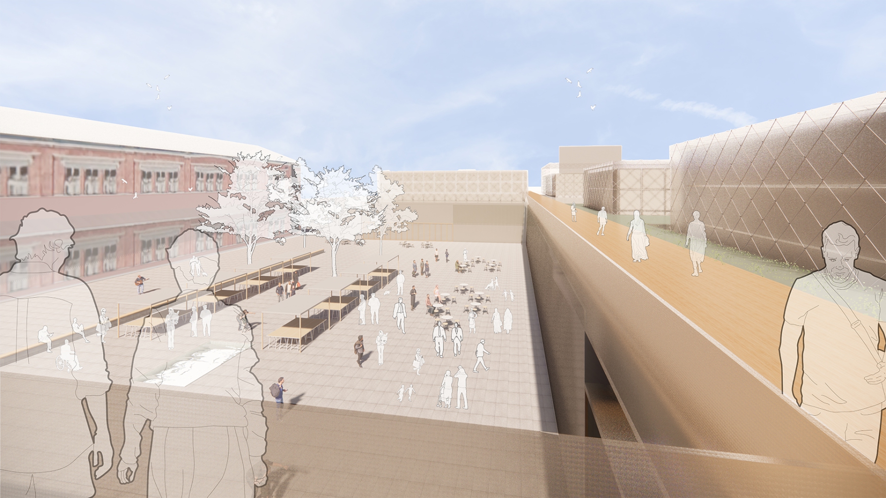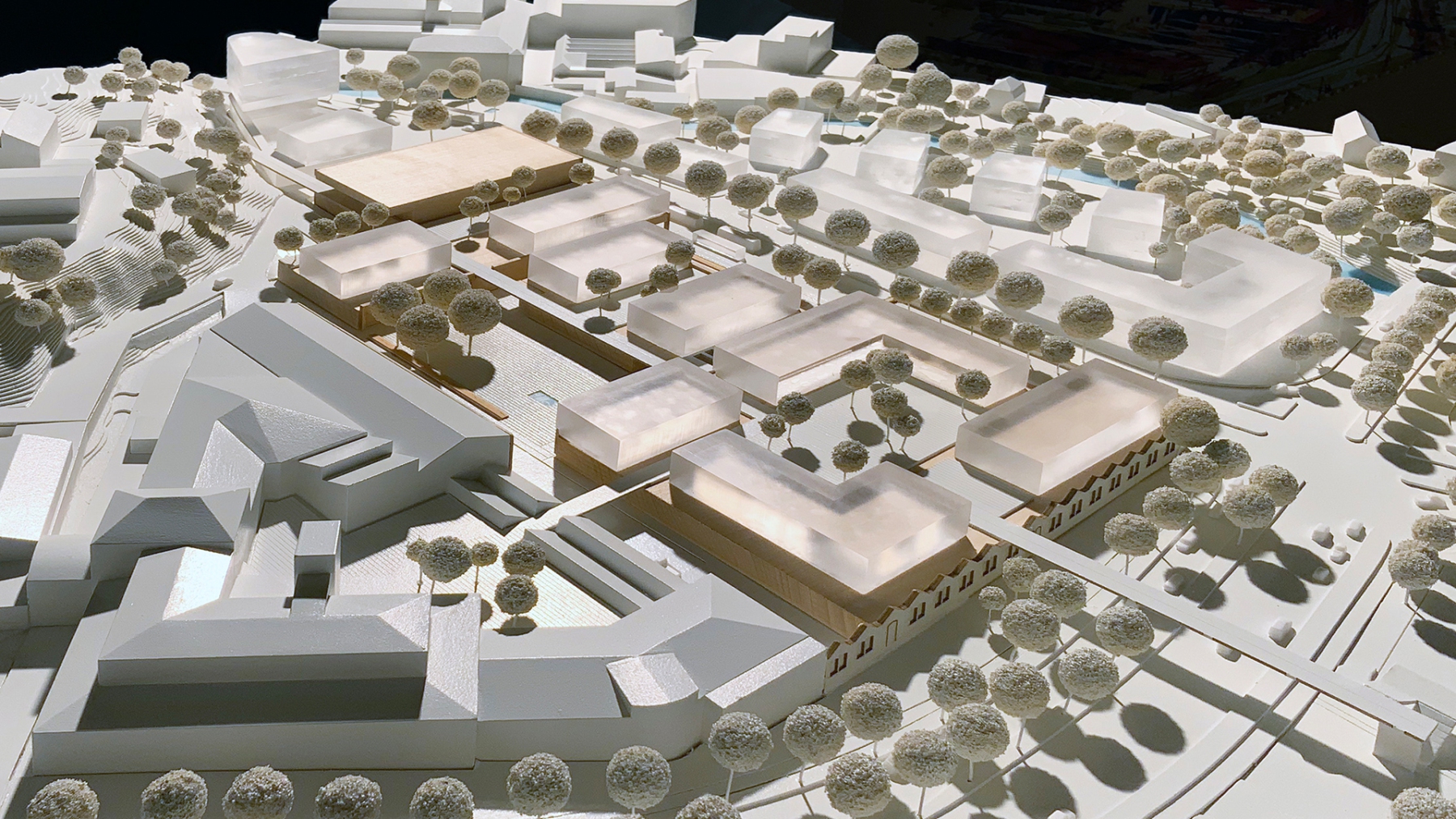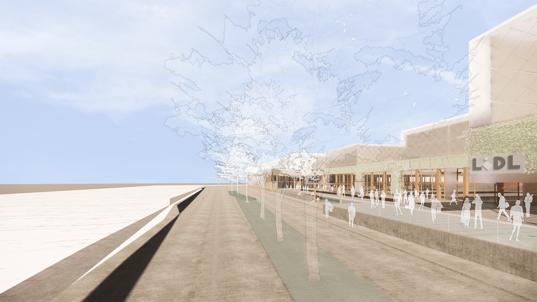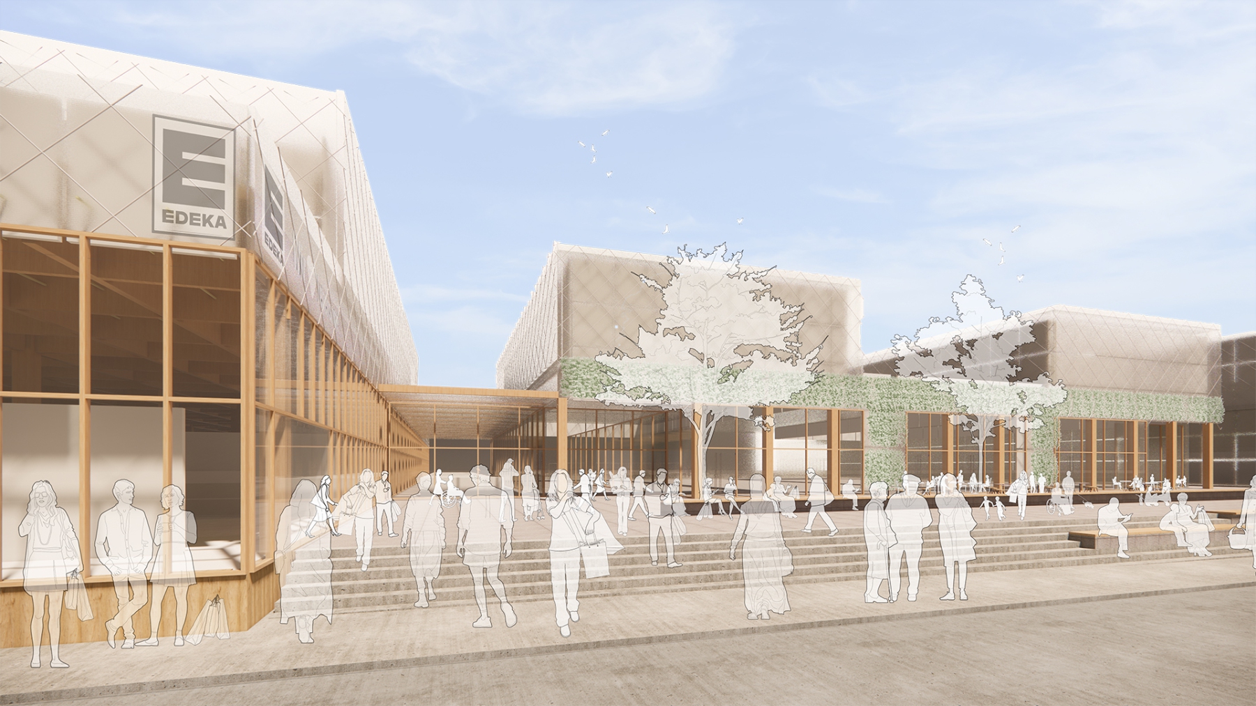 Intensivierung eines Gewerbestandortes zu einem kompakten und hochfrequentierten Einzelhandelsquartier mit neuem Marktplatz und urban genutzter Dachlandschaft für Arbeiten und Wohnen.