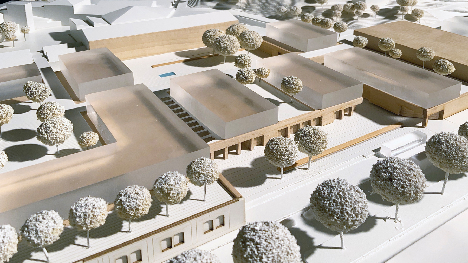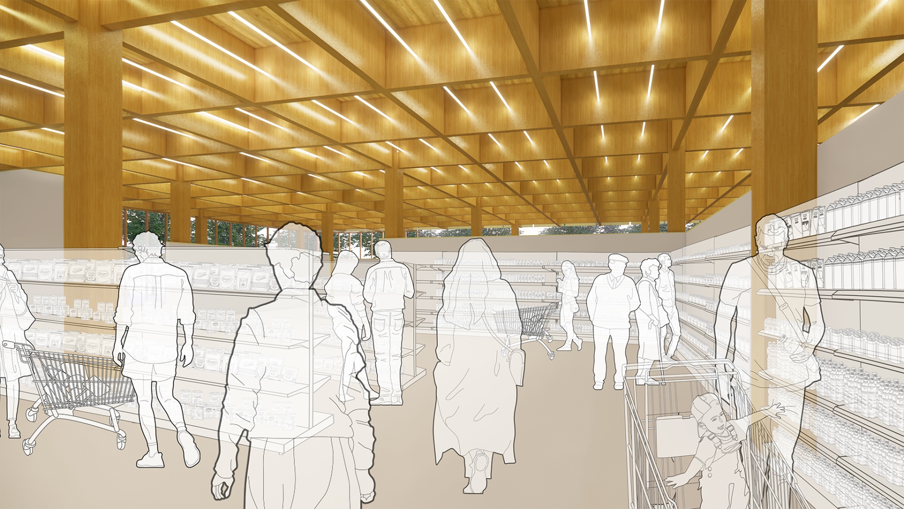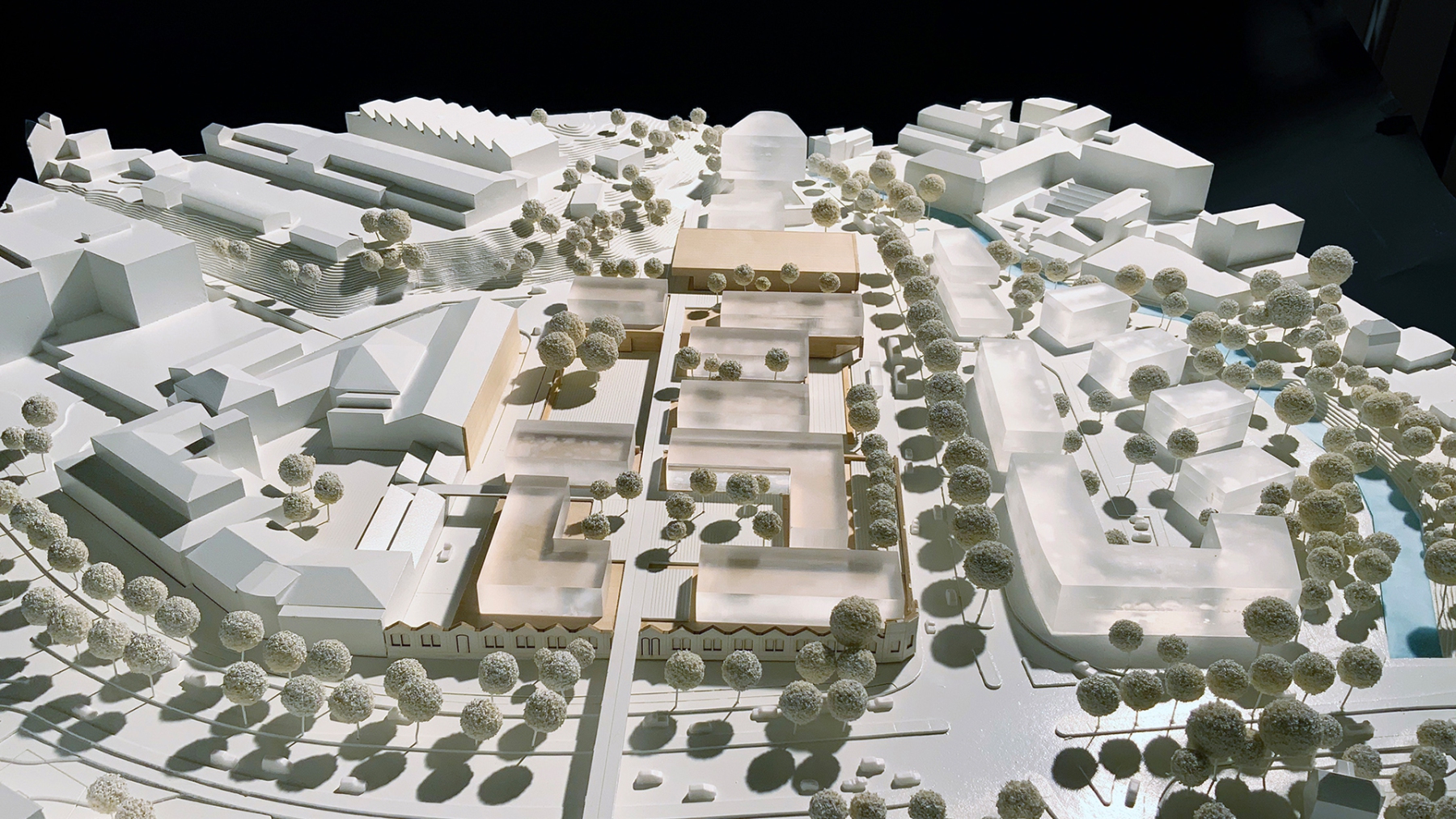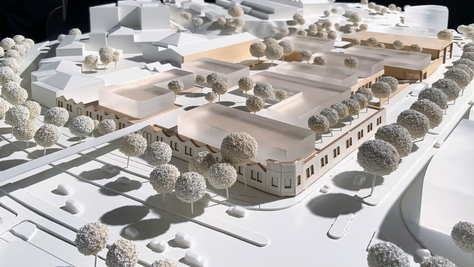 Intensivierung eines Gewerbestandortes zu einem kompakten und hochfrequentierten Einzelhandelsquartier mit neuem Marktplatz und urban genutzter Dachlandschaft für Arbeiten und Wohnen.