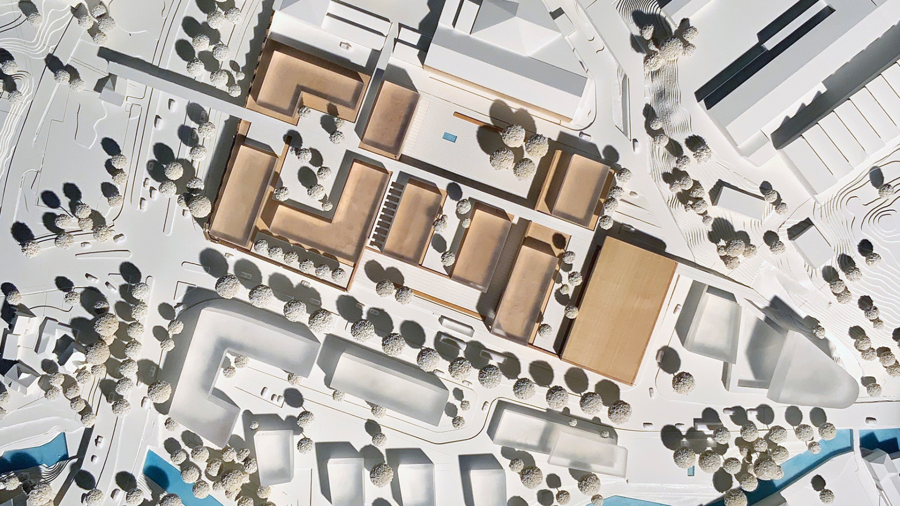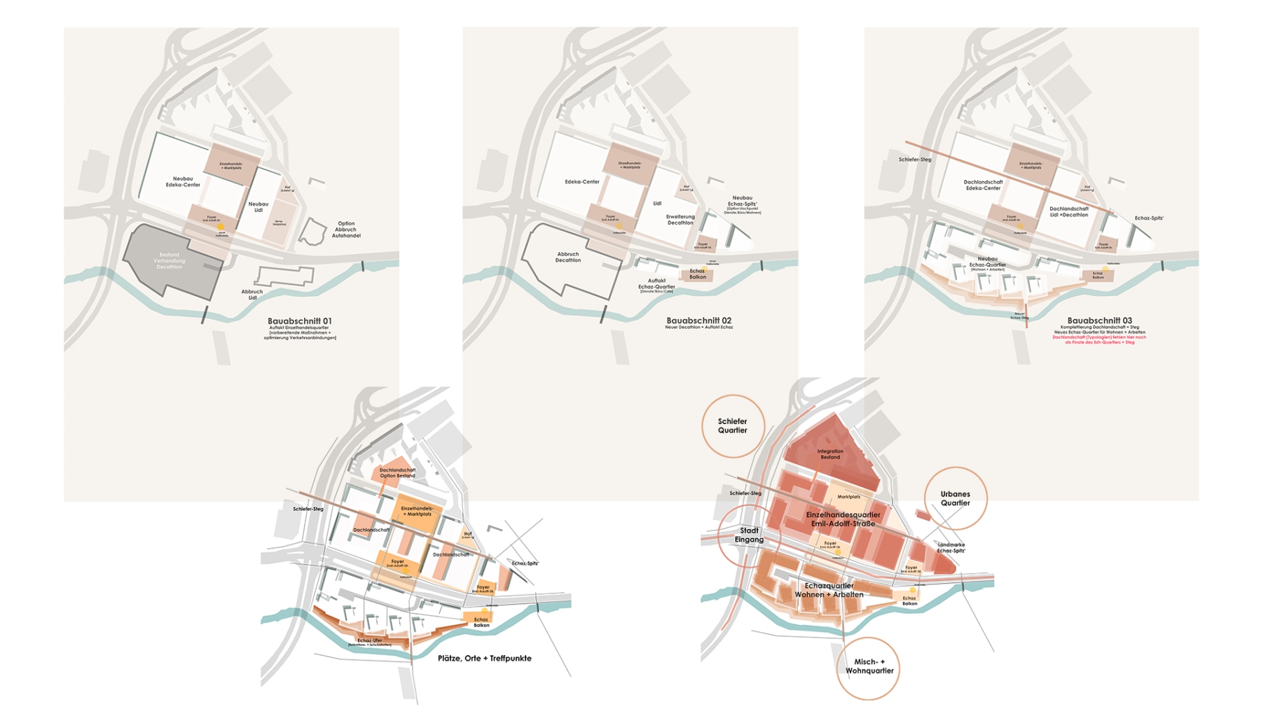 Setzung einer Landmarke – der Echaz-Spitz mit einer Höhe bis 26m – als markantes städtebauliches Gelenk an der freiräumlichen Grün-Gabelung des Echaz-Lauf und der Hangkante. Sie markiert den Anknüpfungspunkt zur Entwicklung des urbanen Quartiers auf dem topographischen Plateau in nordöstlicher Nachbarschaft und leitet von dort den im Konzept vorgeschlagenen Weg (Lauf) über die Dachlandschaften der Einzelhandelssockel hin zum so benannten Schiefersteg ein. Dieser schließt an die neu entstehende Wohnentwicklung und deren bestehende Nachbarquartiere an und vernetzt sich dort mit einem bereits existierenden Park- und Mobilitätsplatz als infrastruktureller Ankerpunkt.