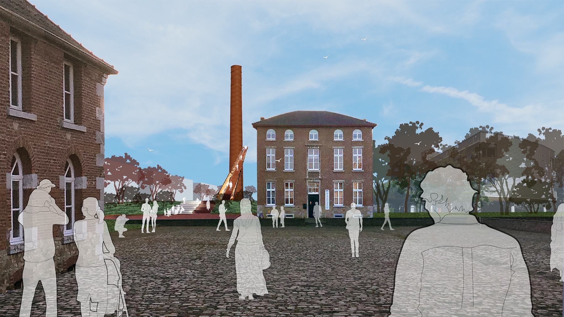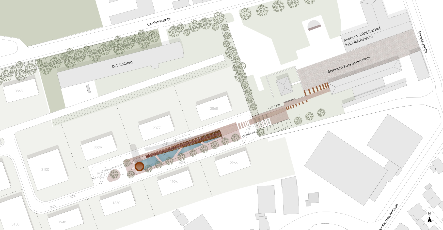 Als Referenz zum Kamin wird dessen Projektion auf die Platzebene in