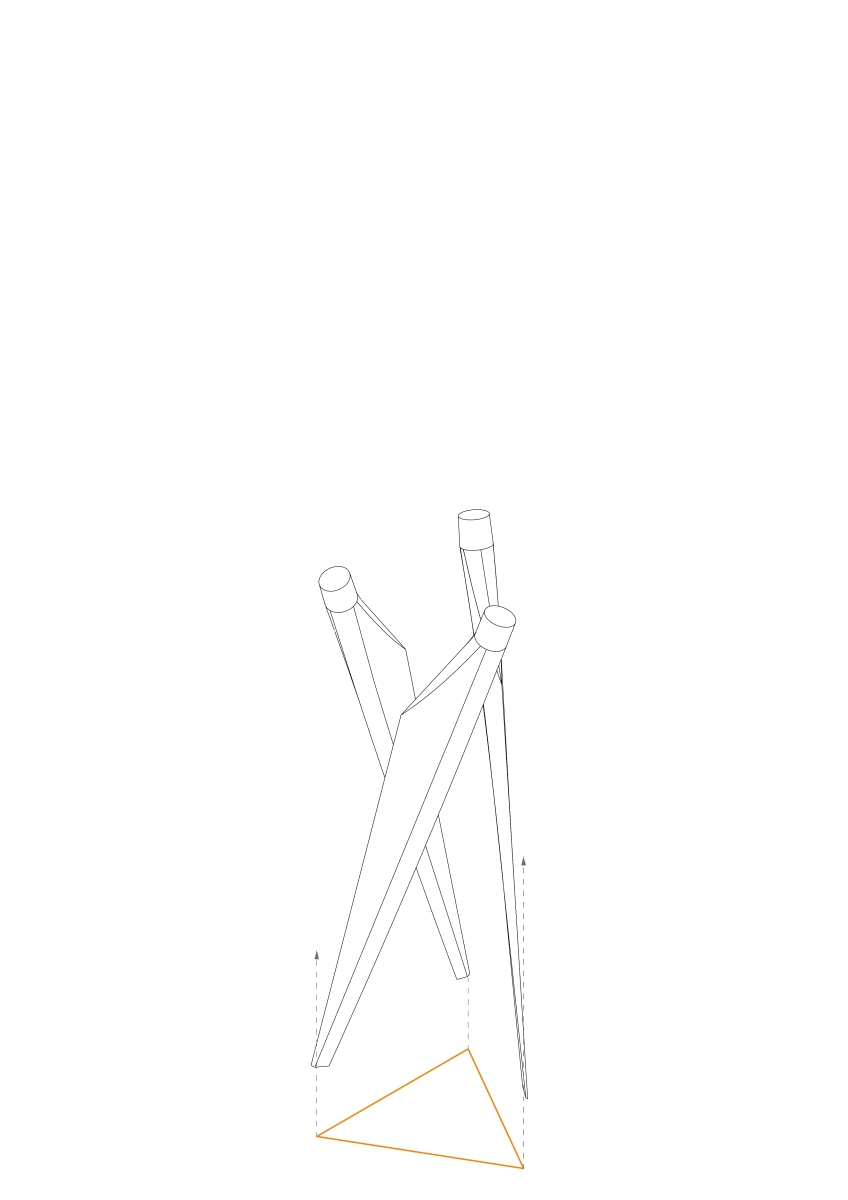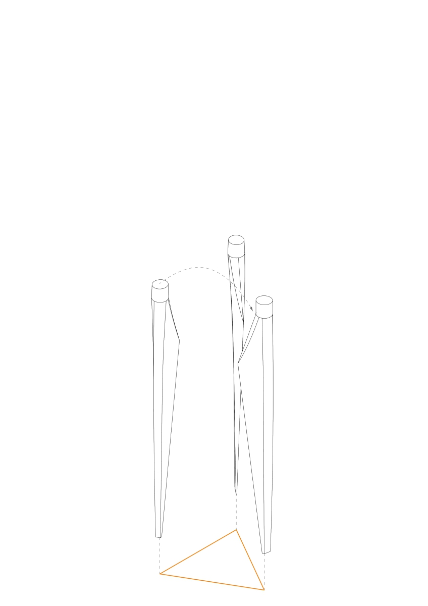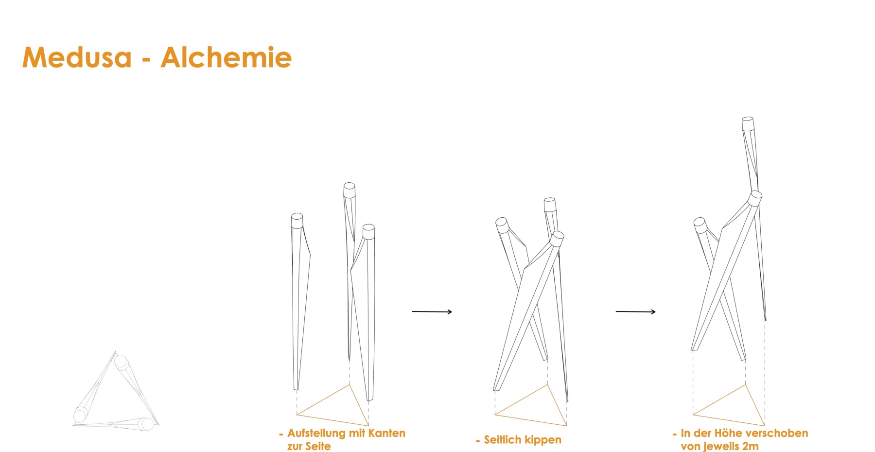 Sie bilden ein Dreieck im Raum. Inspiriert von der Symbolik des alchemistischen Elements Wasser, das für Wandlung, Bewegung und Leben steht.