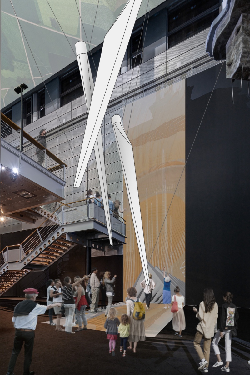 Die Vielansichtigkeit der Installation lädt Besucher*innen ein, die Rotorblätter aus verschiedenen Perspektiven zu erleben.