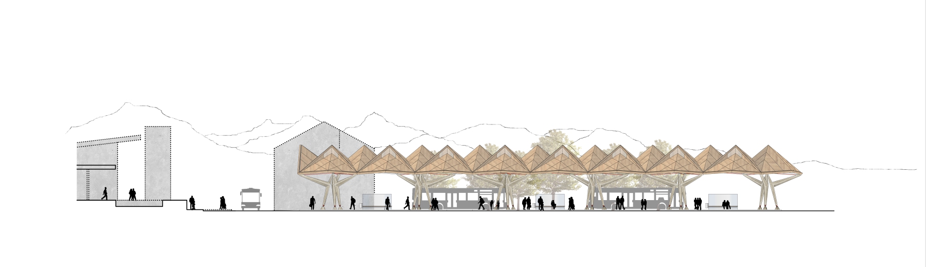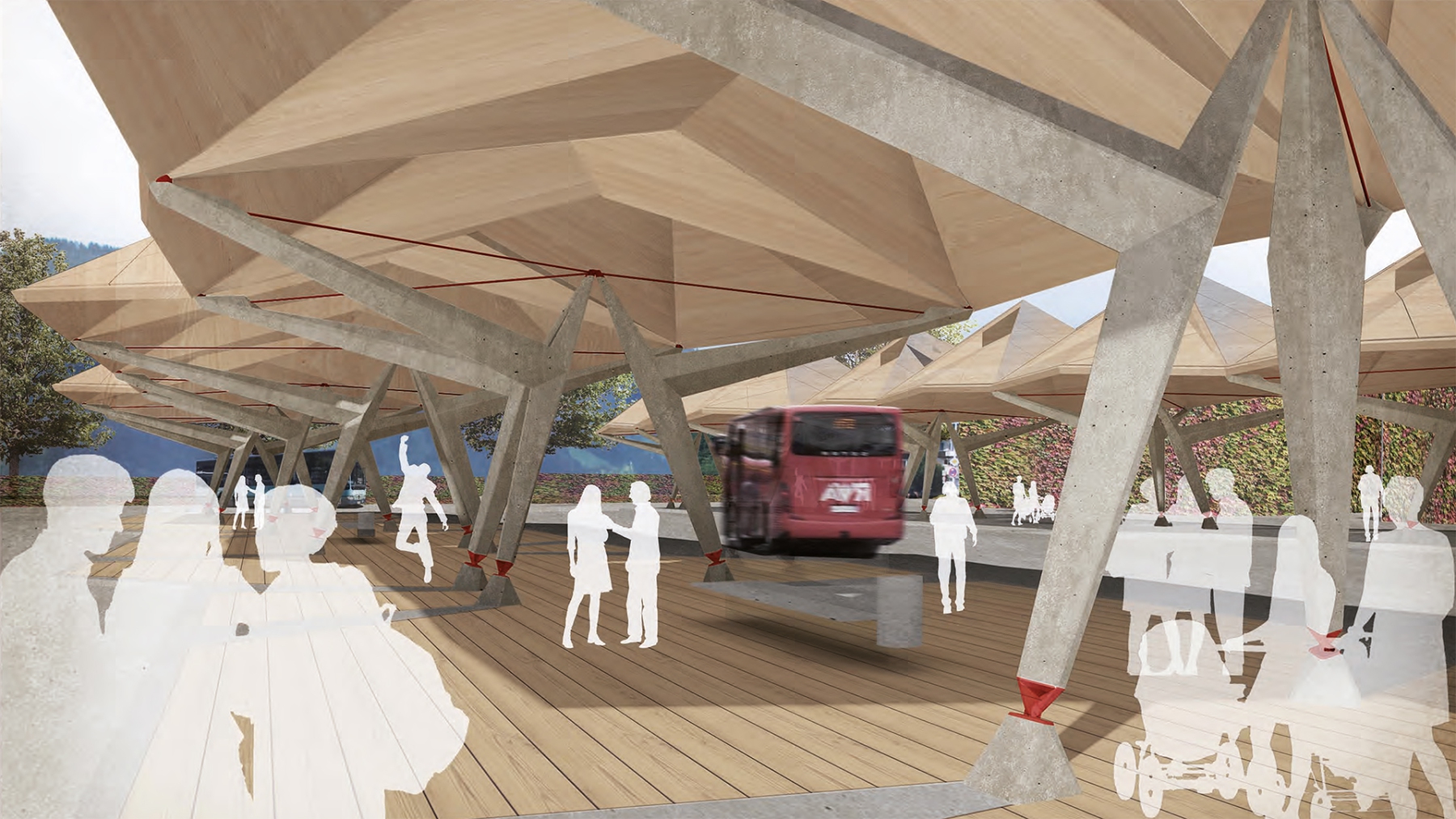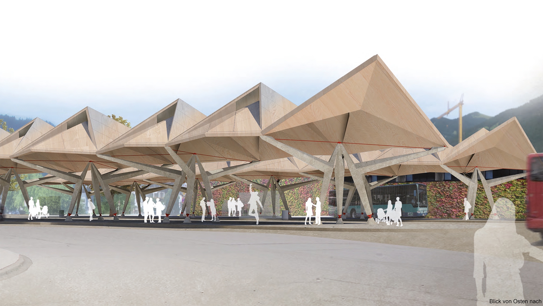 Während die umliegende Bergwelt zur Gestalt der Überdachung der Wartebereiche inspirierte, harmonisieren die Bezüge auf Proportion und Materialität des lokalen Bautyps die Rhythmik der Anlage. Das Mobilitätszentrum Busbahnhof ist, im Sinne des Wortes, eine wahre „Dachlandschaft“.