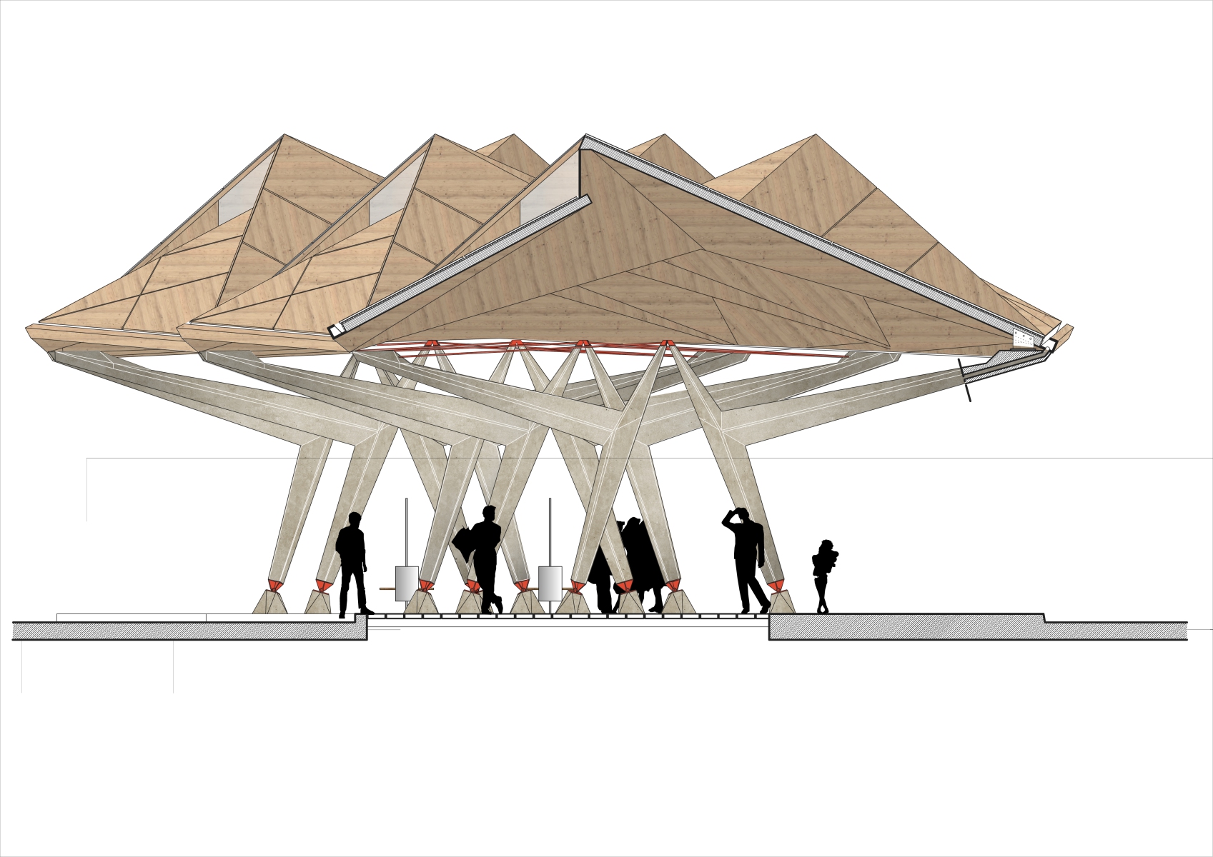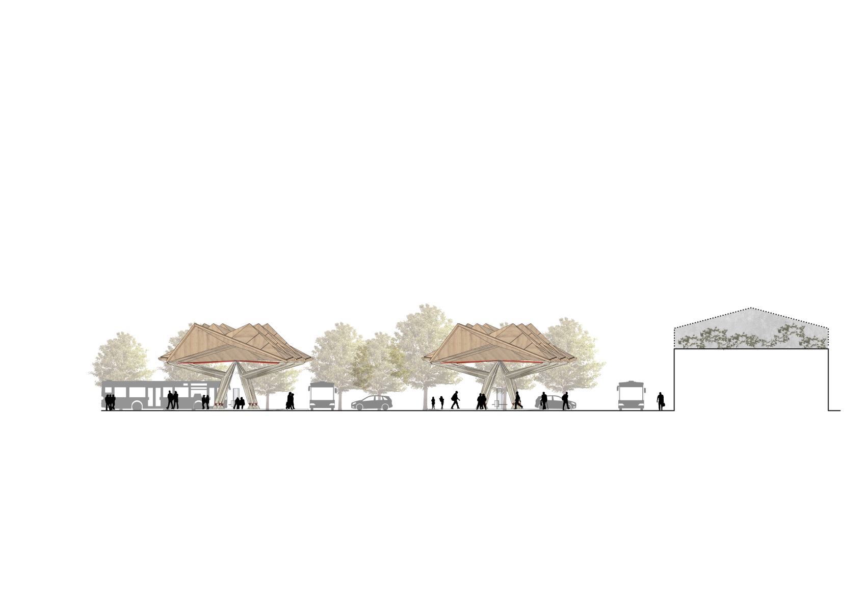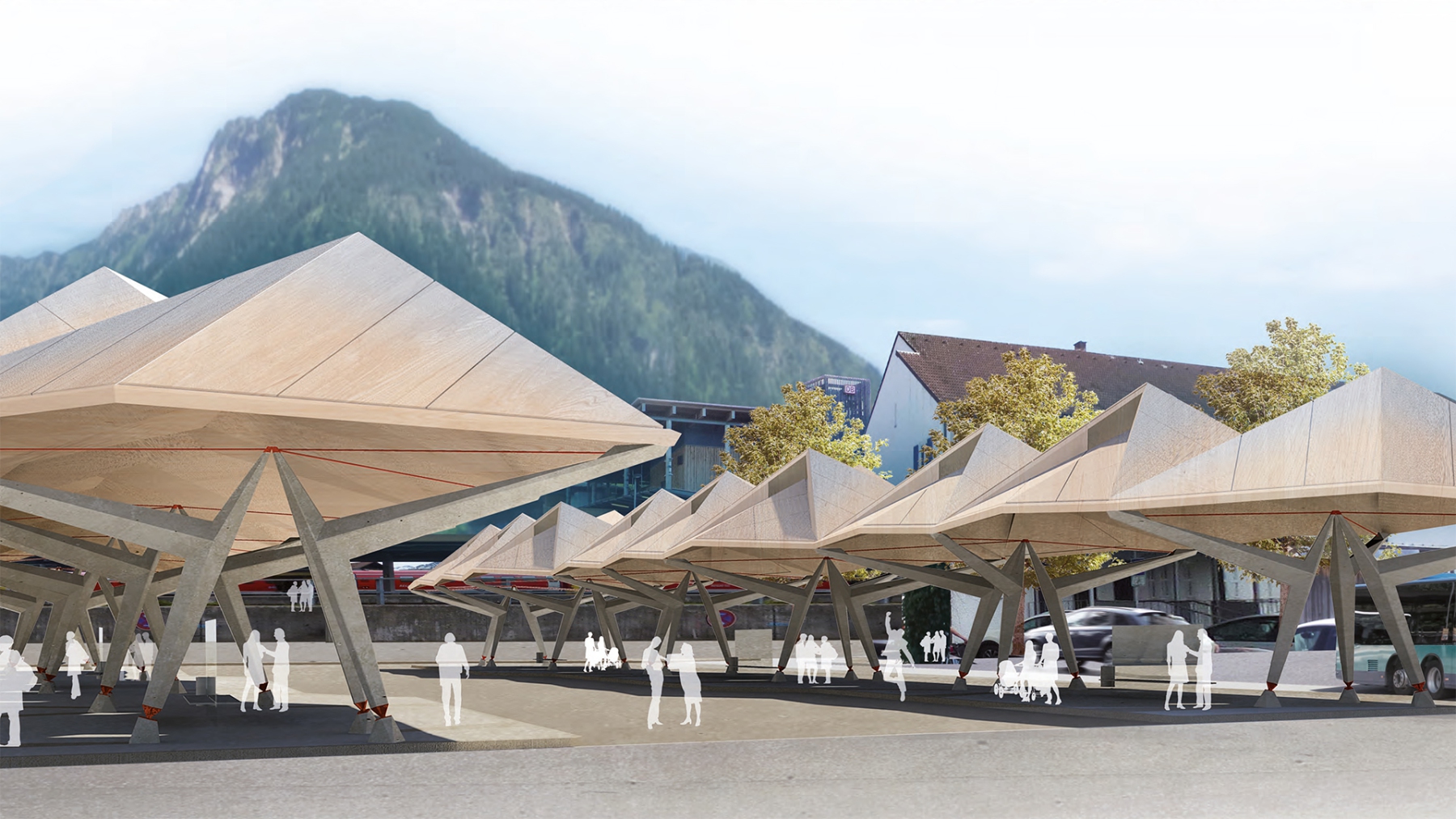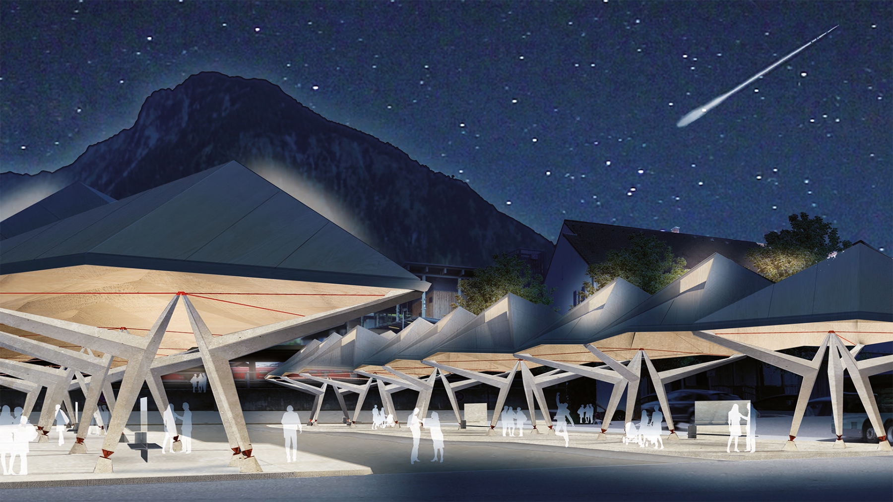 Als Ort der Reise und Ankunft wird der zentrale Bereich vor dem Bahnhof zu einem öffentlichen, einprägsamen und komfortablen Empfangsraum in Markt Oberstdorf. Der großartige Blick auf die zeitlosen Gipfel der umliegenden Berge verbindet sich mit der großzügig geordneten und übersichtlichen Anlage des neuen Busbahnhofes zu einer Wesenseinheit. Der von Gästen wie Einheimischen intuitiv leicht erfassbare Zusammenklang von Natur- und Architekturassoziationen, macht die Gestalt des zukünftigen Mobilitätszentrums in Markt Oberstdorf zu einer Attraktion mit hoher identitätsstiftender Eigenart.