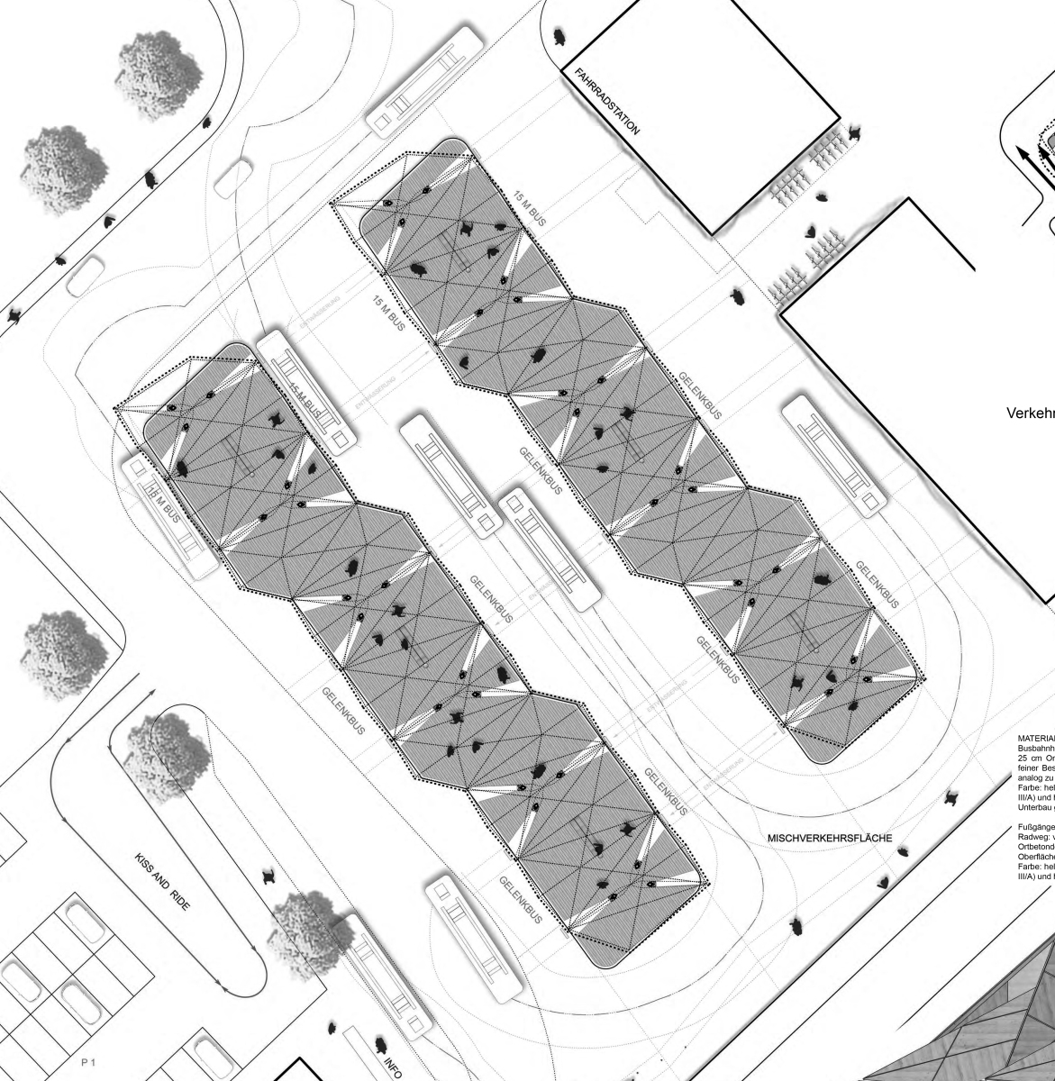 Die Perzeption des Mobilitätszentrums durch die Reisenden wird konsequent durch den Einsatz der Materialien Beton und Lärchenholz verstärkt. Die Oberfläche der Stützen und Bodenschwellen aus kugelgestrahltem, grauem Beton hat eine mineralische, steinerne Anmutung, wohingegen die überdachten Wartebereich- und die Dachaußenflächen aus Lärchenkernholz mit dem stark aromatischen Geruch, gemacht sind. Beide Materialien zeichnen sich durch ihre konstruktive Qualität, Robustheit und gleichzeitige Sinnlichkeit aus.