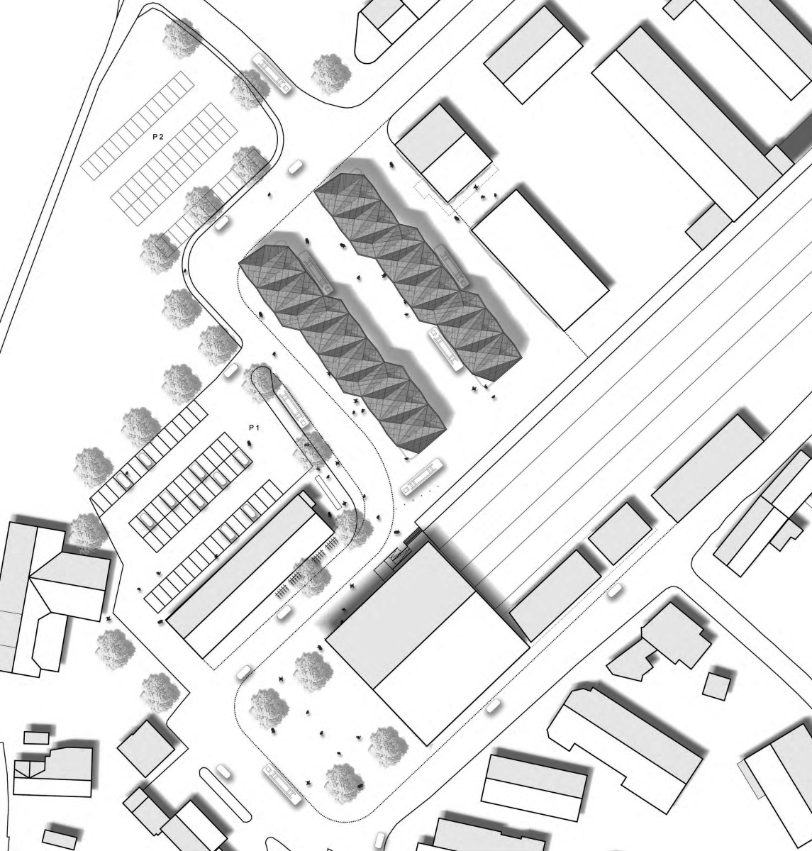 Die städtebauliche Einordnung des neuen Busbahnhofs greift die prägnante Ausrichtung, die die Erschliessung durch die Bahngleise in die Struktur der Marktgemeinde gezeichnet hat, auf. Es handelt sich hier um eine wichtige Mobilitätsader, die für das Funktionieren des Ortes eine zentrale Bedeutung hat. Um die Ausrichtung und Geometrie des Kopfbahnhofs zu unterstreichen, baut der Busbahnhof auf einem ortogonalem Grundriss auf. Unterstützt durch die Parkplatzanlage hinter dem Touristcenter findet die städtebaulich wichtige Anlage der „Mobilitätsader“ eine ruhige und geometrisch schlüssige Einfassung.
